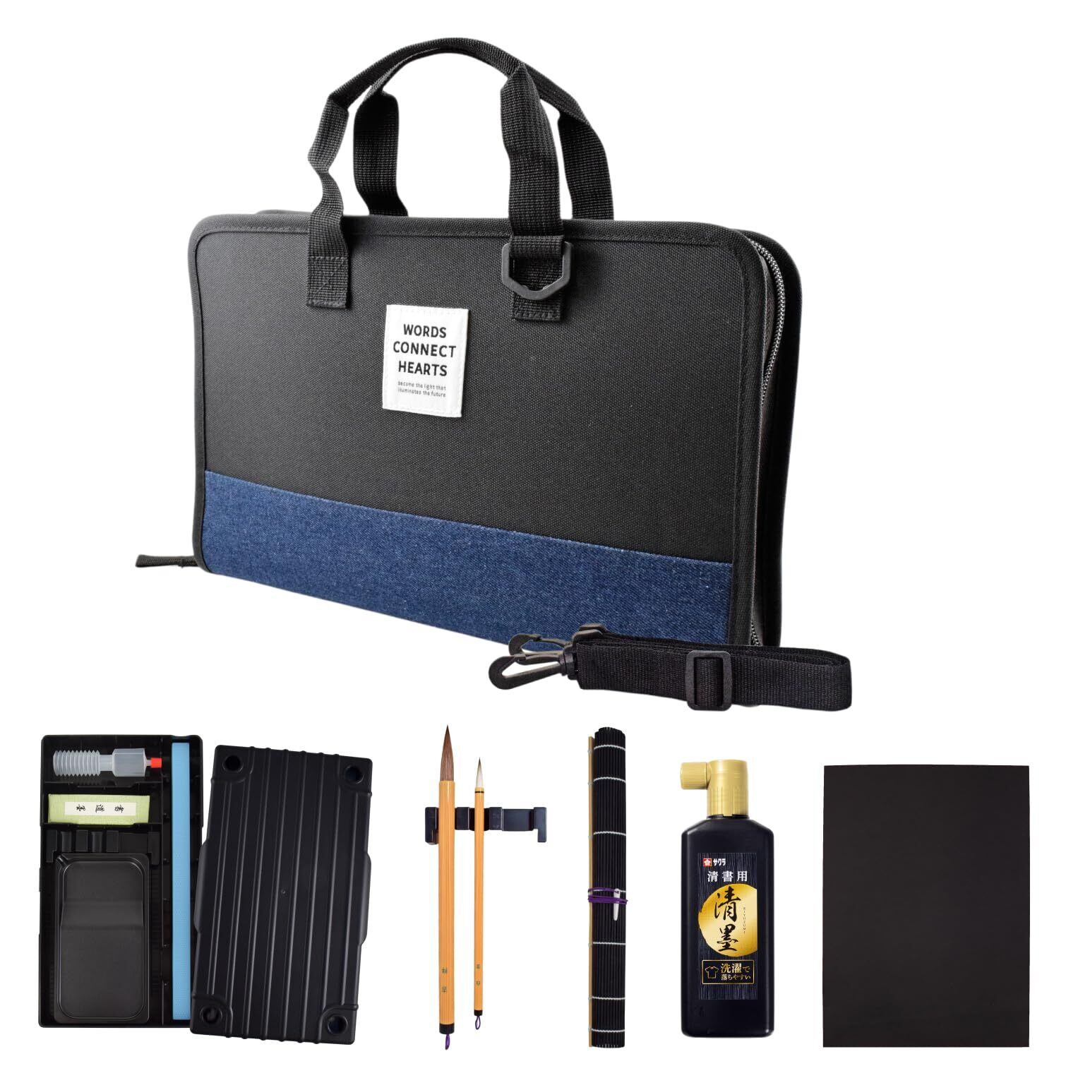 【内容】固形墨、墨汁(清墨180ml)、軽量両面硯(四五平)、太筆、細筆、筆巻(竹製)、文鎮(1本)、水差し、中皿(蓋付き)、筆置き、下敷き、書写セットの使い方、半紙ホルダー一体型バッグ(ショルダーベルト付き)