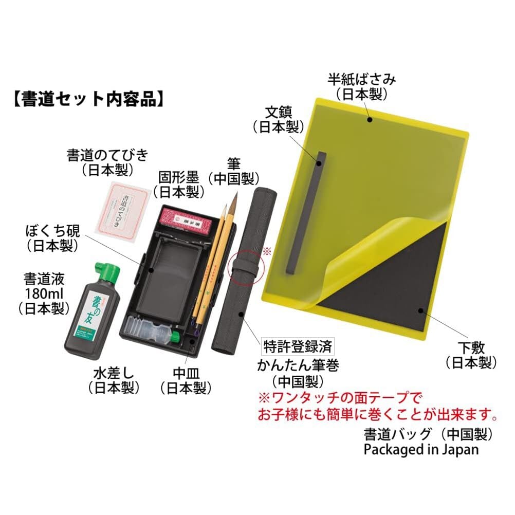【内容】固形墨/書の友(180ml)/筆(太筆・細筆)/ぼくちすずり/文鎮/下敷/水差し/かんたん筆巻/半紙ばさみ/中皿/書道バッグ/書道のてびき