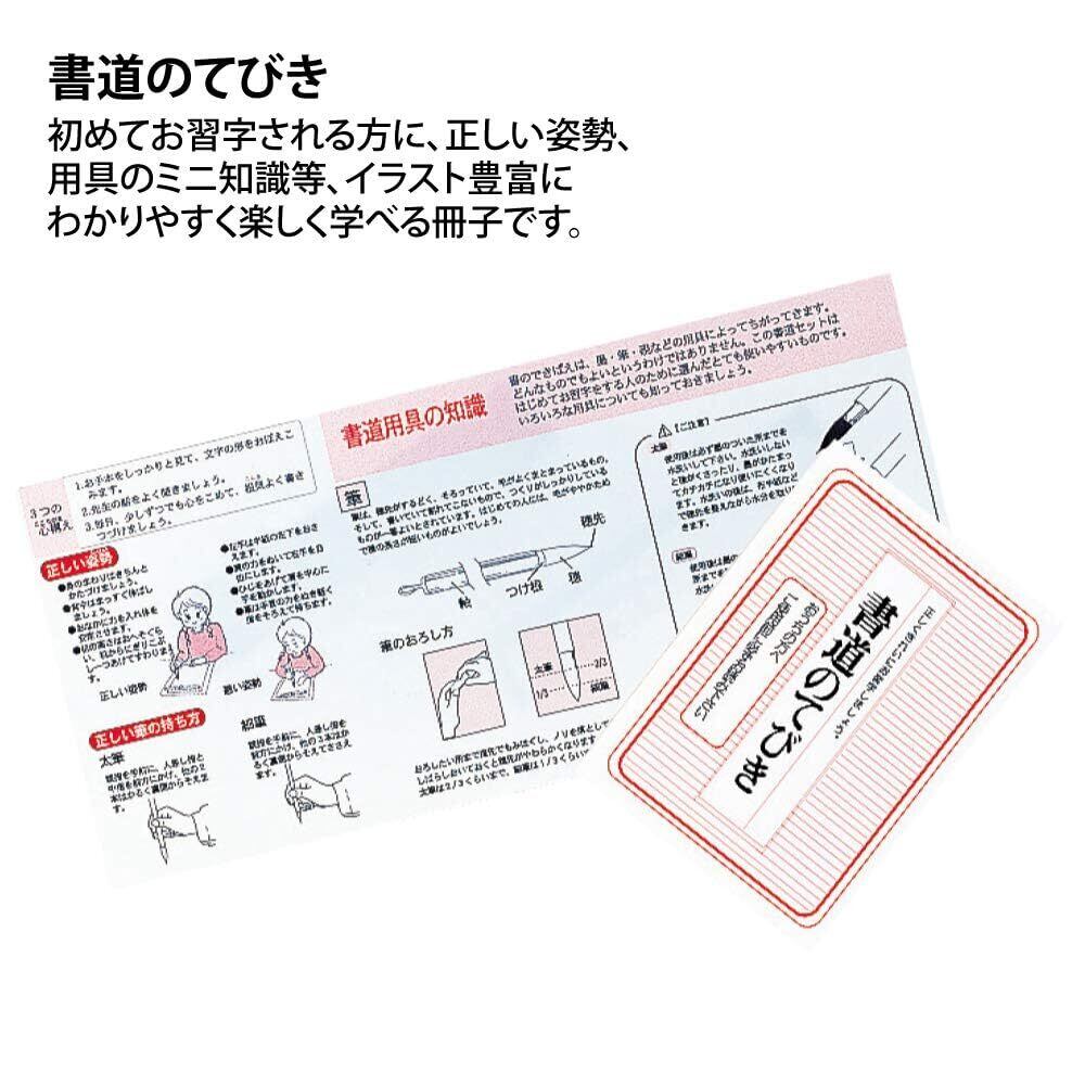 【セット内容】固形墨、書道液(180ml)、筆(太筆・細筆)、すずり(5.3平)、半紙(10枚入)、筆巻、文鎮、下敷、水差し、中皿(蓋なし)、書道バッグ、てびき、名前シール