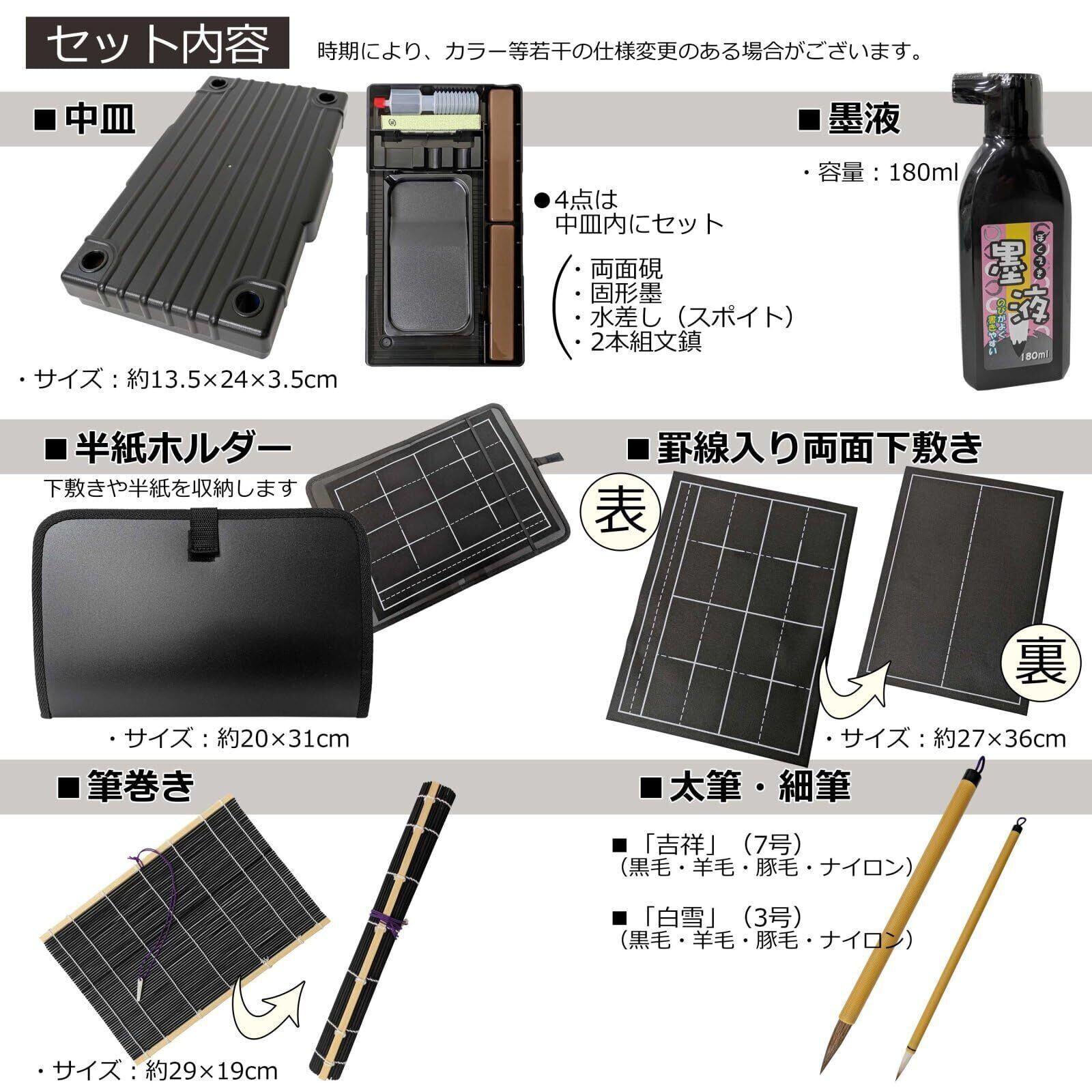 【セット内容】 ・書道バック ショルダーベルト付 ・中皿(フタ付) ・半紙ホルダー ・太筆 ・細筆 ・軽量プラすずり(4.5平) ・罫線入下敷 ・筆巻き ・墨液(180ml) ・墨 ・水差し ・2本組文鎮:茶