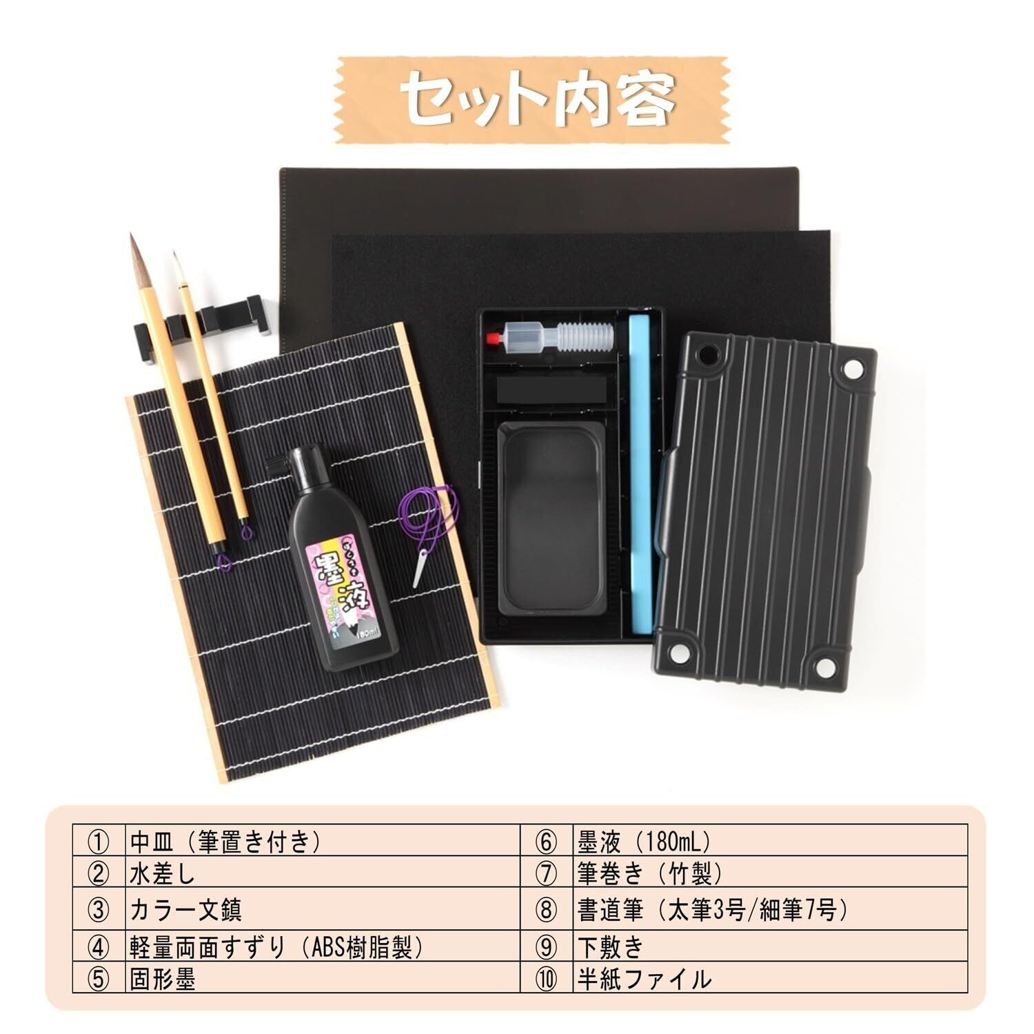 【セット内容】筆(太・細2本組)/墨液/軽量硯(樹脂)/下敷/中皿/半紙ファイル/水差/文鎮/固形墨/筆巻/筆置き
