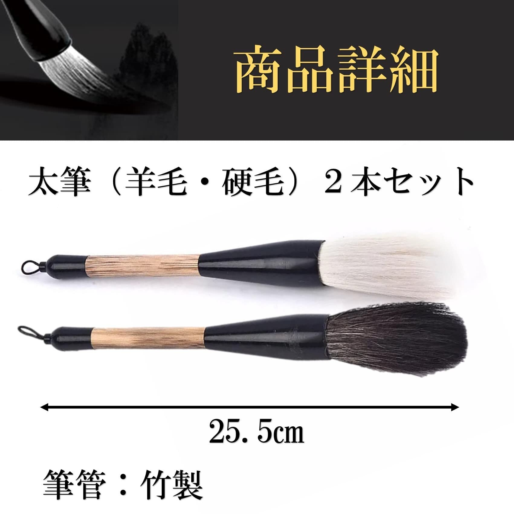 商品詳細:書道筆 太筆(羊毛・硬毛)2種2本セット【サイズ】約25.5㎝ 筆管 竹製 ※モニターの環境等により、色の見え方に若干差が生じる場合がございます。予めご了承ください。