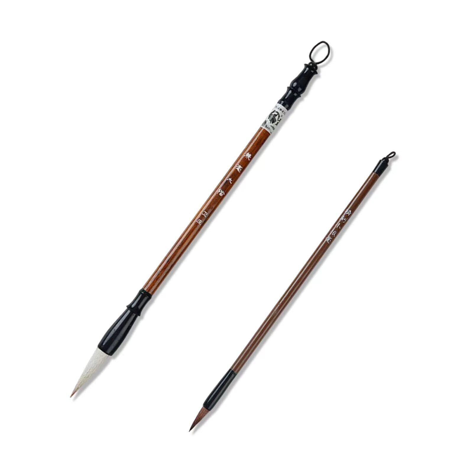 【仕様と素材】太筆:穂長40mm、穂径10mm,木製軸,動物の毛; 細筆:穂長20mm、穂径5mm,木製軸,動物の毛。
