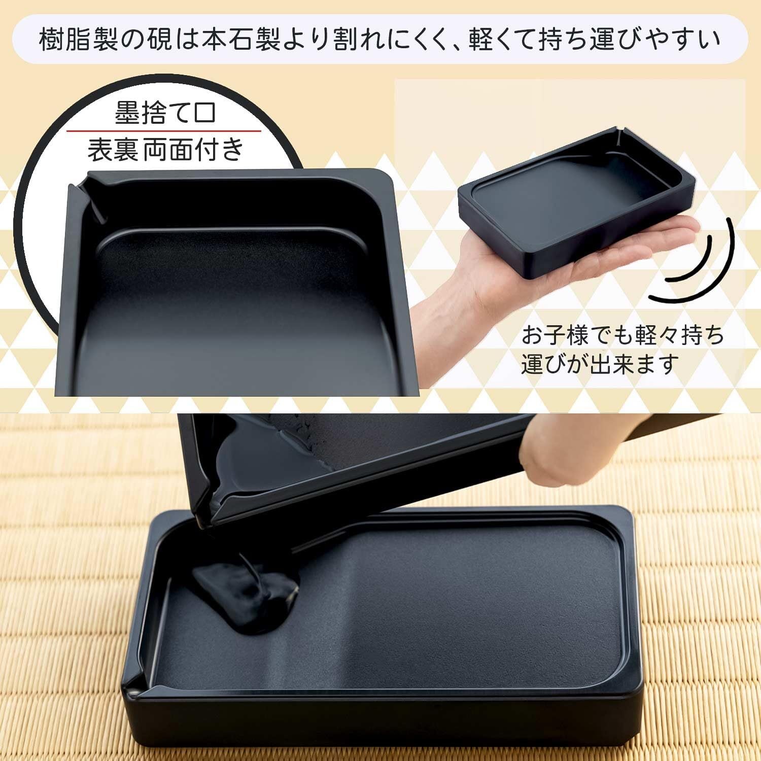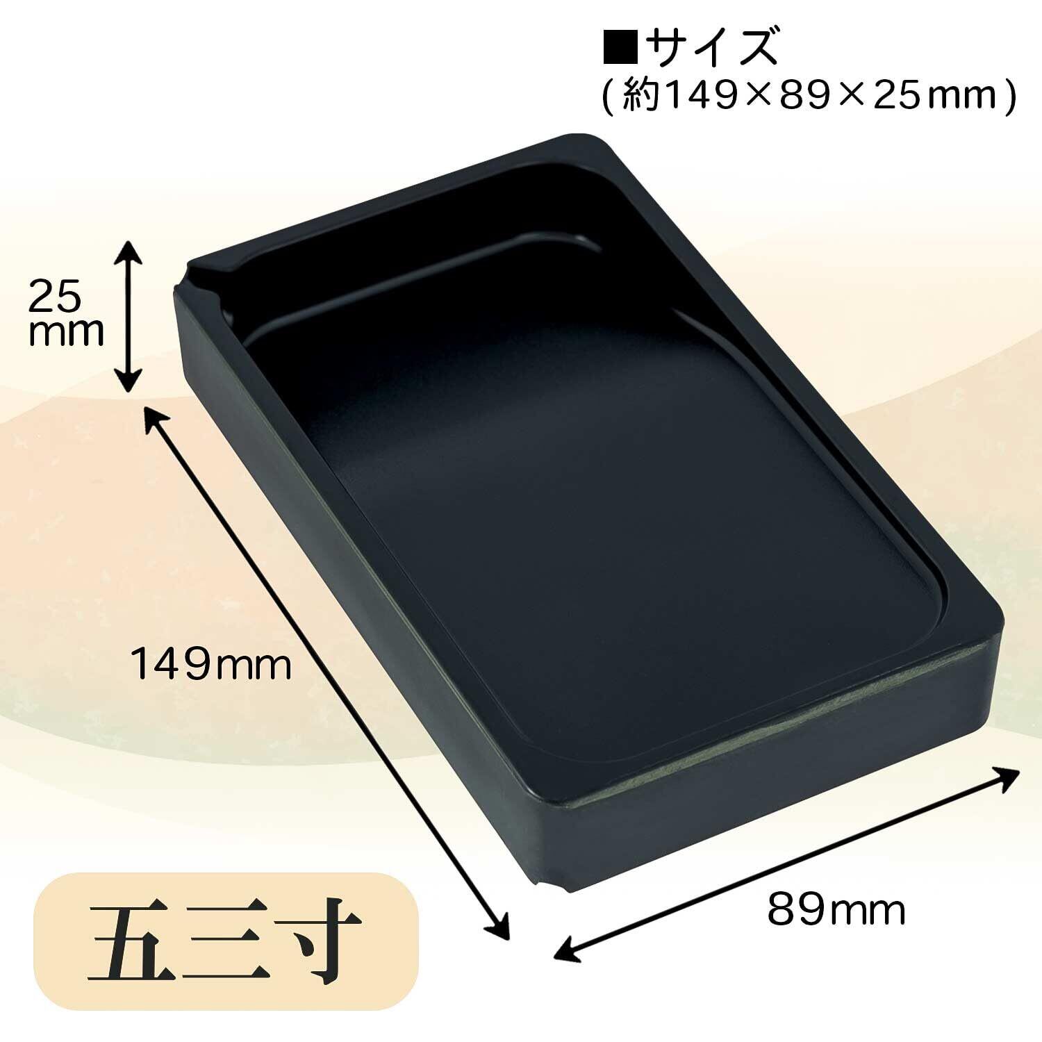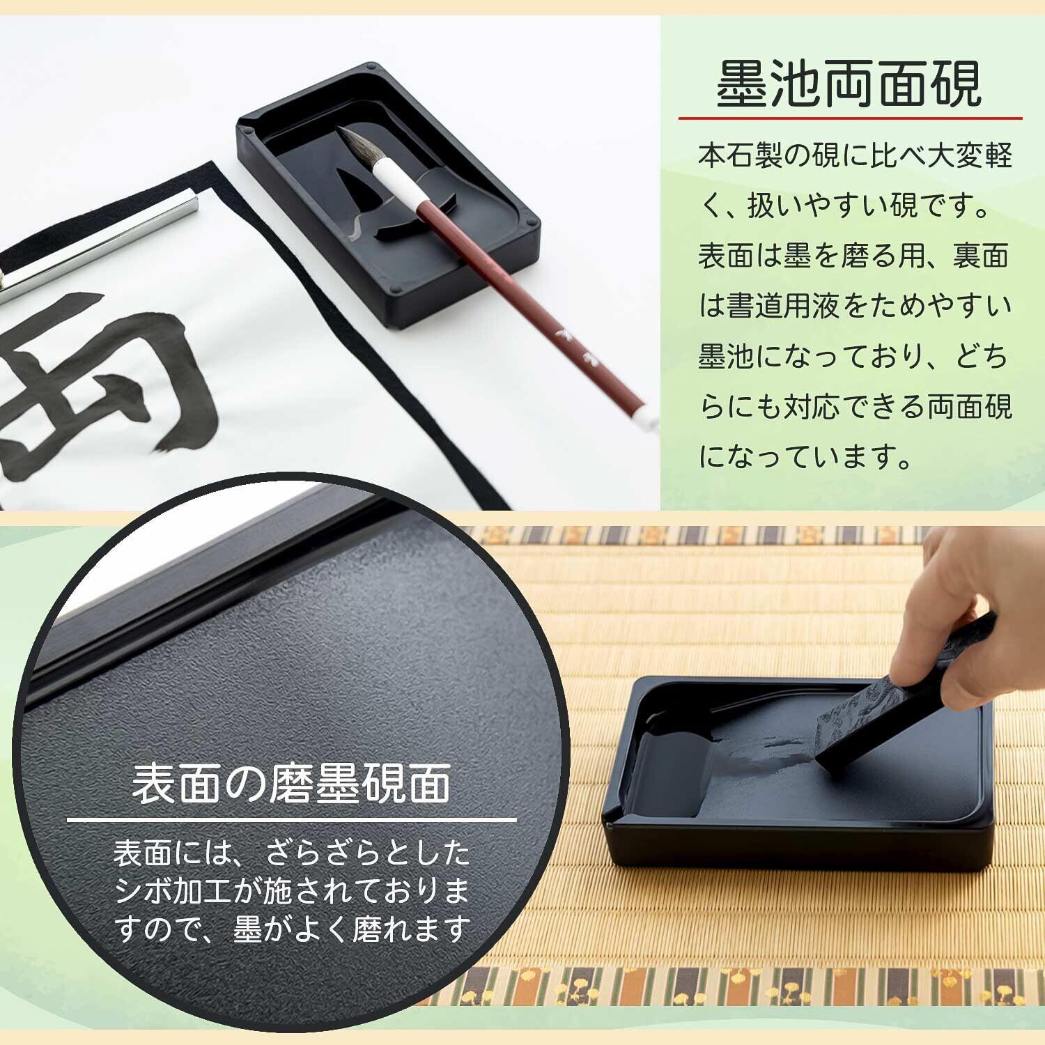 【特徴】表面には墨が磨りやすいようなシボ加工、裏面には筆ならし・筆置き付き