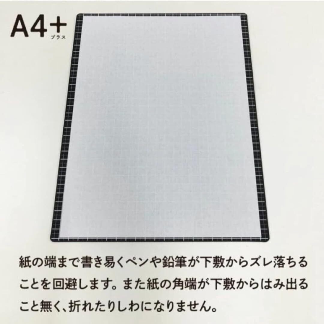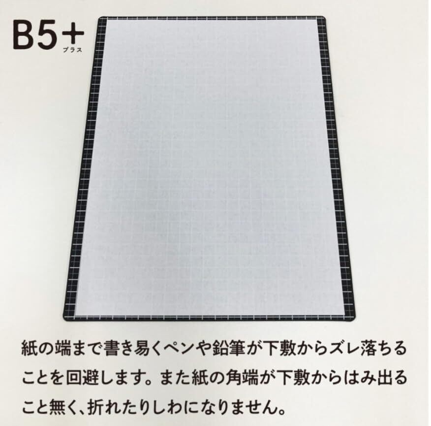 B5+・A4+は、サイズ用紙より少し大きめのサイズであるため紙の角端が下敷からはみ出ることなく、折れたりしわになったりするのを防ぐ。 ・紙に対して滑り止め効果のある特殊加工のPVC再生マット生地を使用。 ・表面は方眼タイプ、裏面は無地タイプでリバーシブル仕様。 ・裏面は無地仕様でコピーやスキャンの下地に敷く事で裏写りが軽減される。