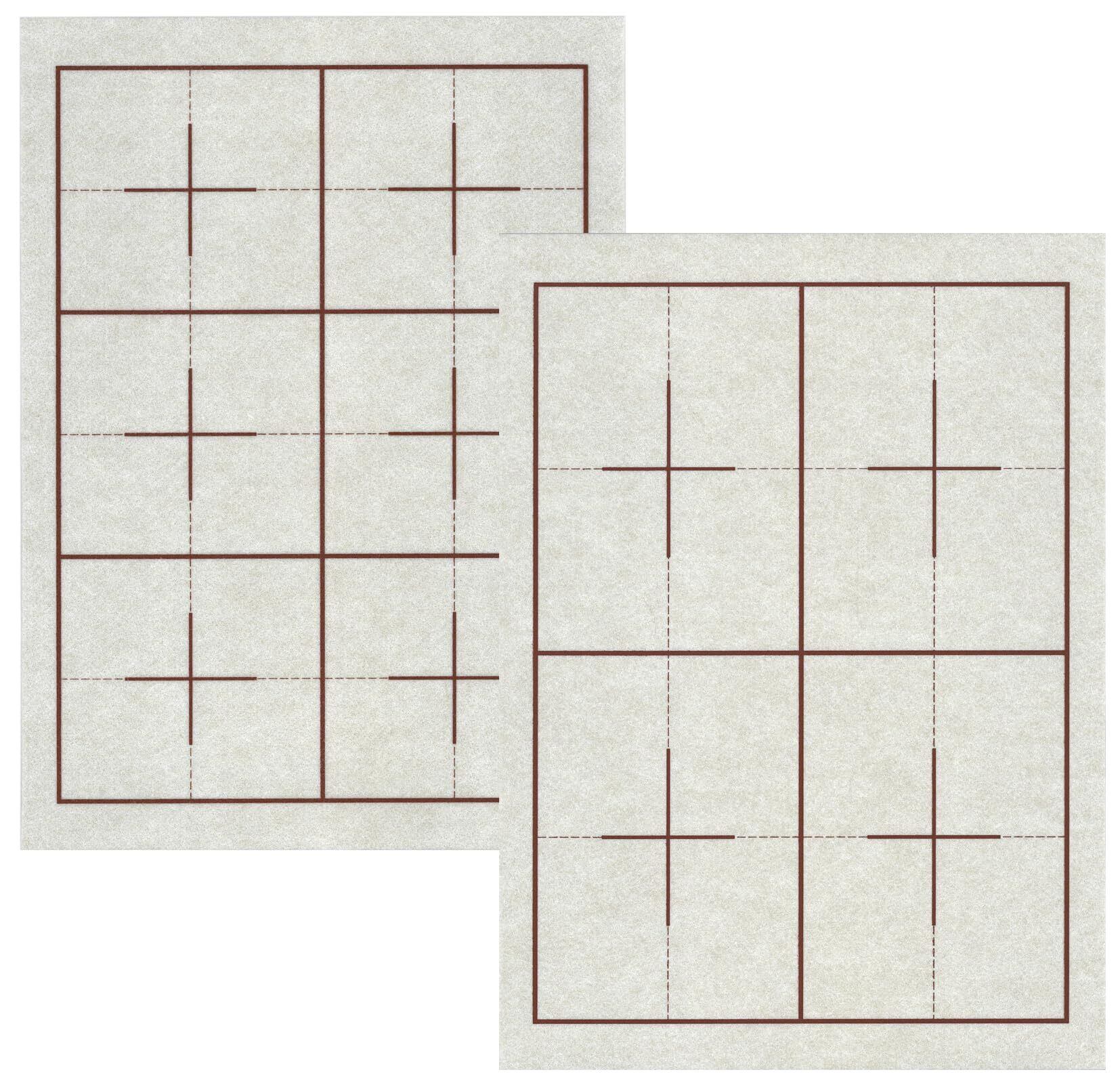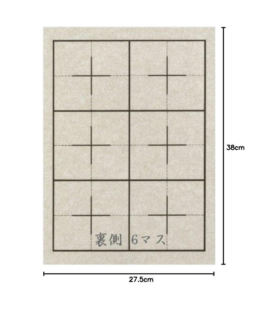 こげ茶色のガイド線が表面4マス、裏面6マスに印刷されており、半紙に折り目をつけることなく文字の配置バランスが取りやすく、初心者から上級者まで正しい字形を身につけやすい設計です。