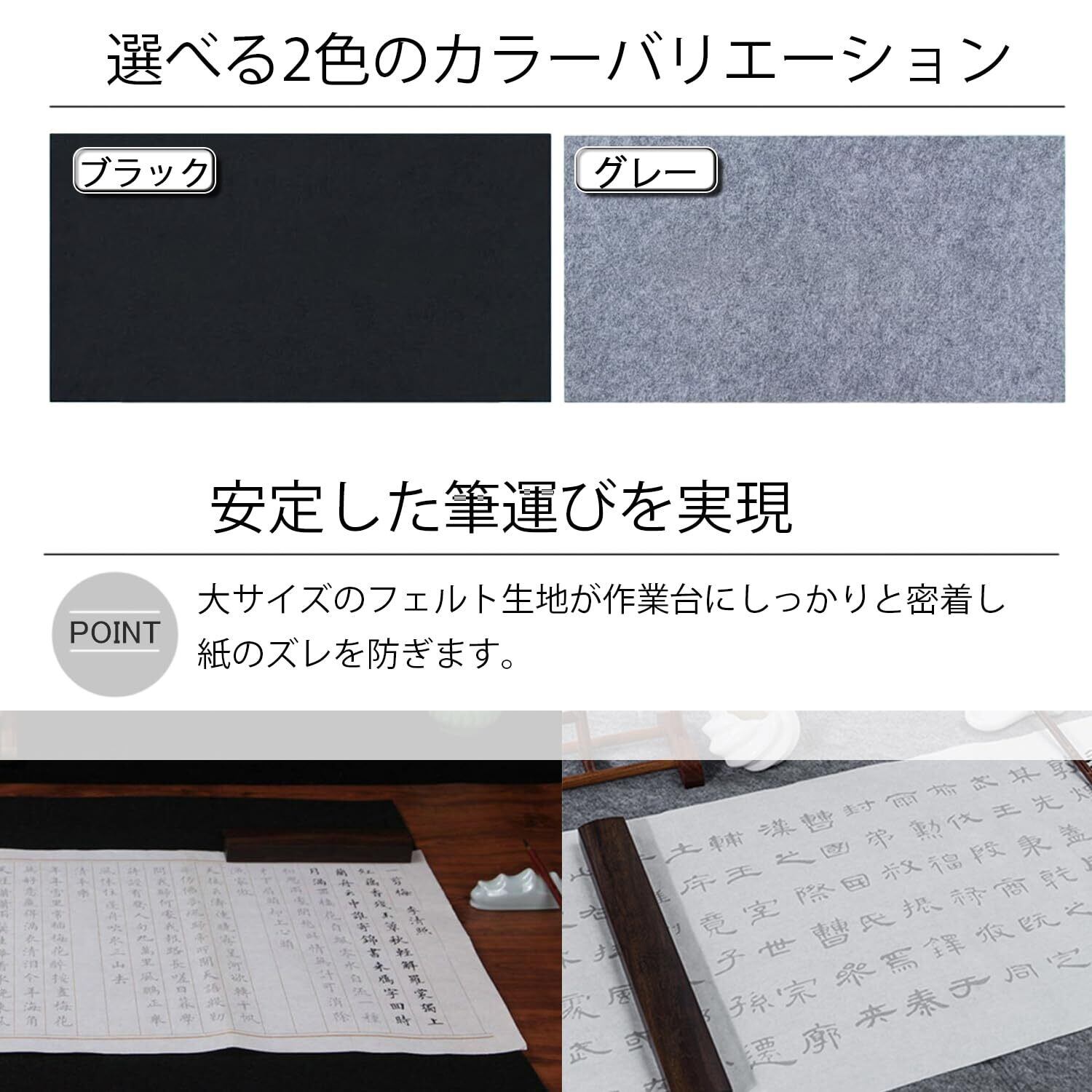 【選べる2色のカラーバリエーション】 定番の黒(ブラック)、落ち着いた雰囲気の灰色(グレー)、2色から選択可能。作品や用途に合わせて使い分けができます。書道以外にも、毛氈として茶道や生け花、展示用の布としてもご使用いただけます。