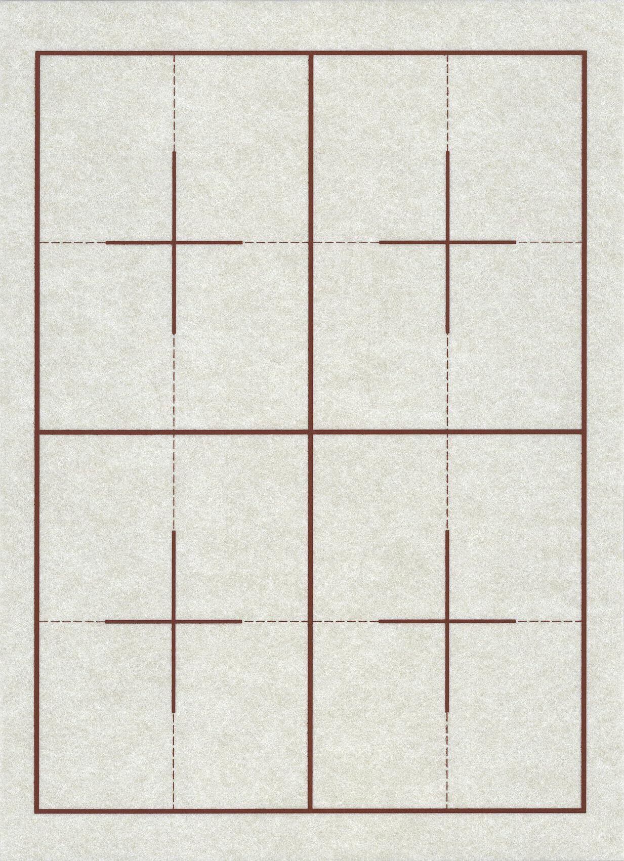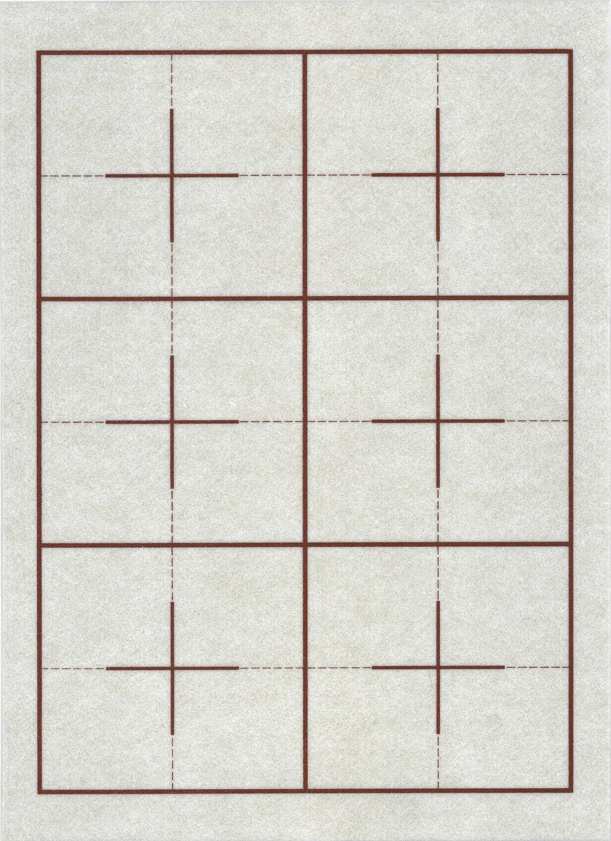 【名前欄なし・5枚セット】書写練習をもっと快適に、もっと上手に。半紙用・両面罫線入りの書道下敷きです。こげ茶色のガイド線が表面4マス、裏面6マスに印刷されており、半紙に折り目をつけることなく文字の配置バランスが取りやすく、初心者から上級者まで正しい字形を身につけやすい設計です。・サイズ:27.5cm × 38cm × 厚さ2.7mm ・カラー:オフホワイト(罫線:こげ茶色) ・材質:フェルト製(テトロン100%) ・製法:綿を針で打ち固めた特殊フェルト製法 ・生産地:繊維の街・愛知県蒲郡市