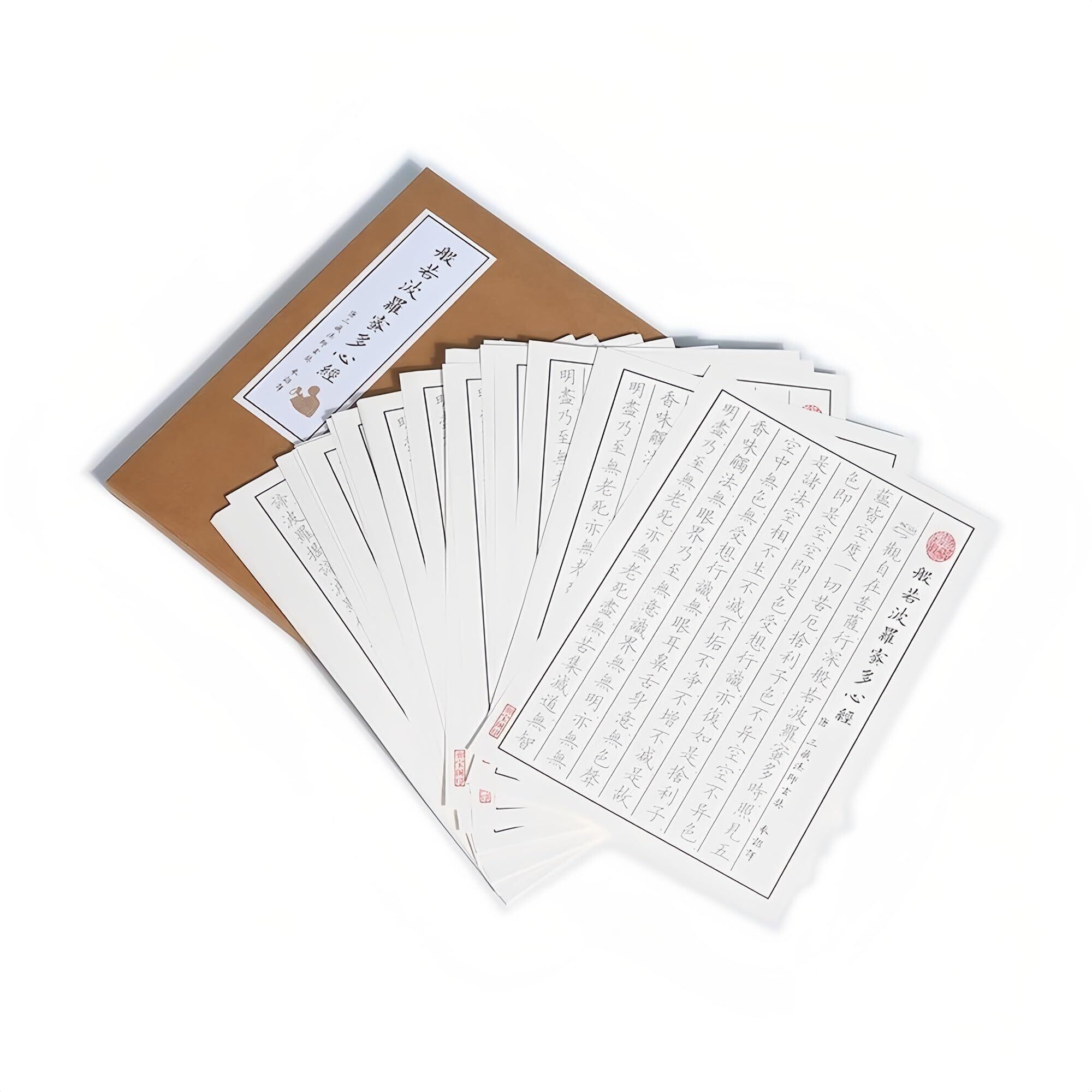 1.【なぞり書き写経冊】 : 1冊40枚.心経は2枚の紙、1冊は20枚の心経。写経用紙.般若波羅蜜多心経.なぞり書き写経冊.ルーズリーフ綴じ.一字ずつに見本をうすかげ印刷されているのなぞり書きタイプですので、書きやすい、初心者たちも簡単に写経練習できます.