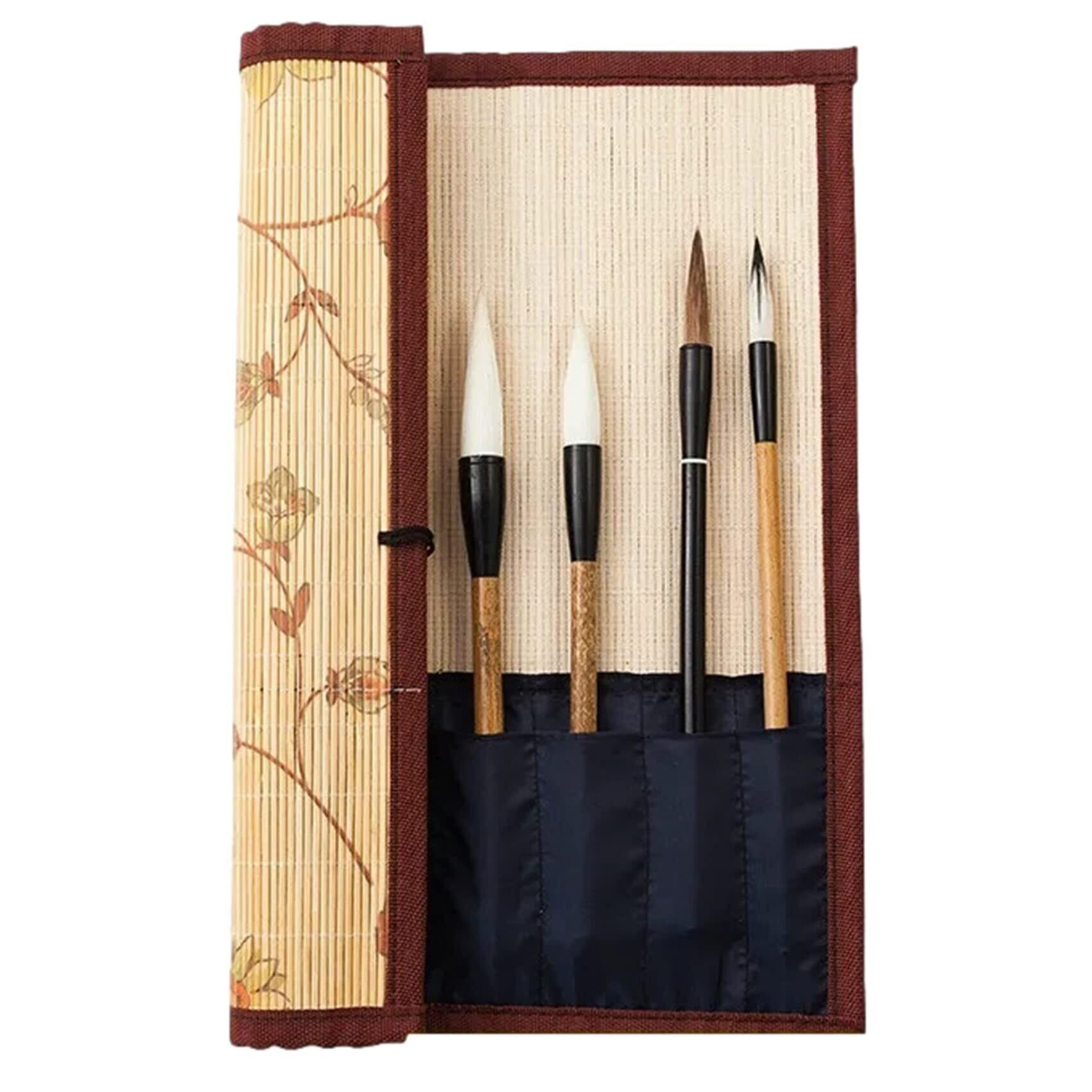 NOELAMOUR 筆巻き 書道 筆入れ 筆ケース 竹製 花柄 ポケット付き 筆 収納 保管 持ち運び (花柄 Mサイズ)