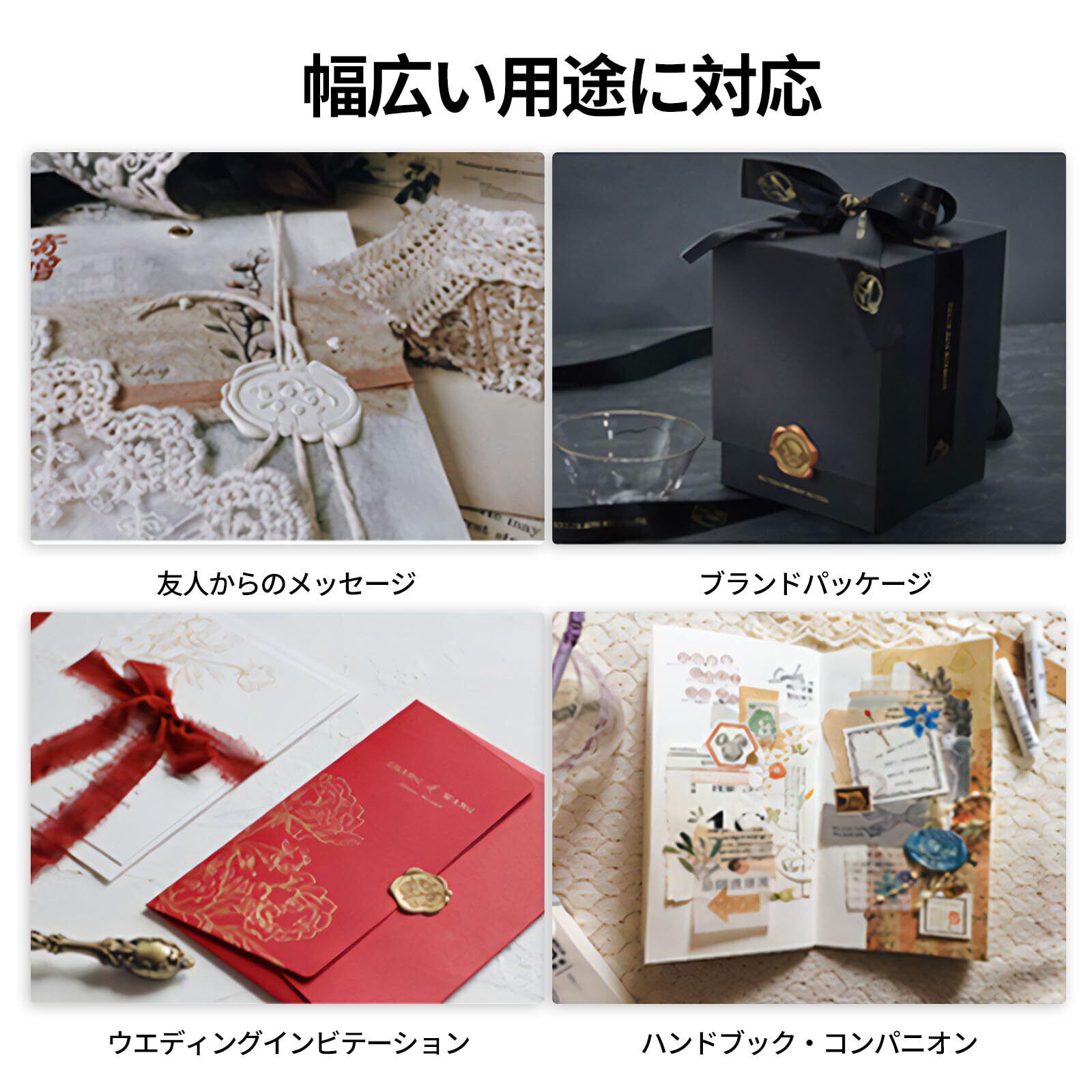 【多様な用途】:シーリングスタンプ 手紙の封蝋や招待状作り、アルバムやカード作り、コラージュなど、さまざまな用途でご利用いただけます。さまざまなスタイルから選ぶことができる。