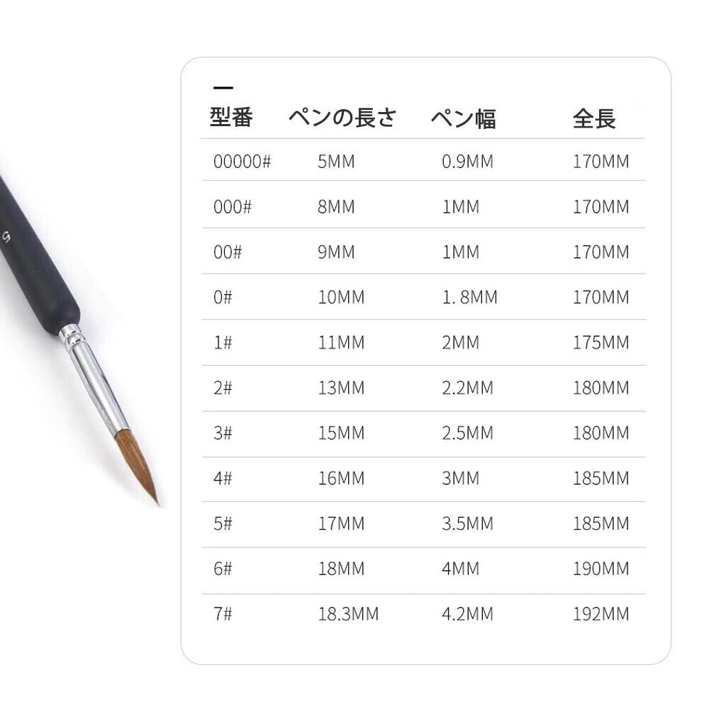 【セット内容】11本セット(00000~7)豊かなサイズ、細い筆から太い筆まである程度揃っているのでとても使い勝手がいいです。