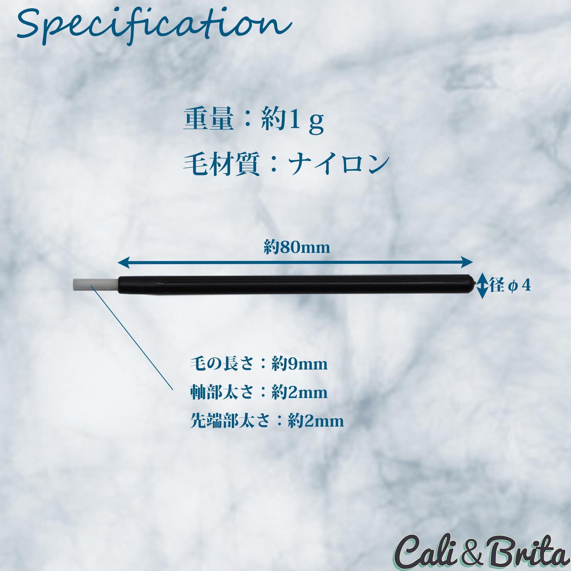 【仕様】筆毛材質:ナイロン 重量:約1g 筆サイズ:全長約90mm 柄径4mm 筆毛サイズ:長さ約9mm 軸部径約2mm 筆先径約2mm