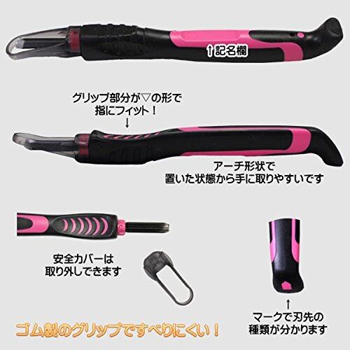 グリップは、ソフトラバー製で滑りにくく、三角形状の太グリップで転がりません。切出し刀のみ右利き用、左利き用で刃の向きが異なります。安全カバー(安全ガード)付き。切り出し刀は専用キャップ付きです。