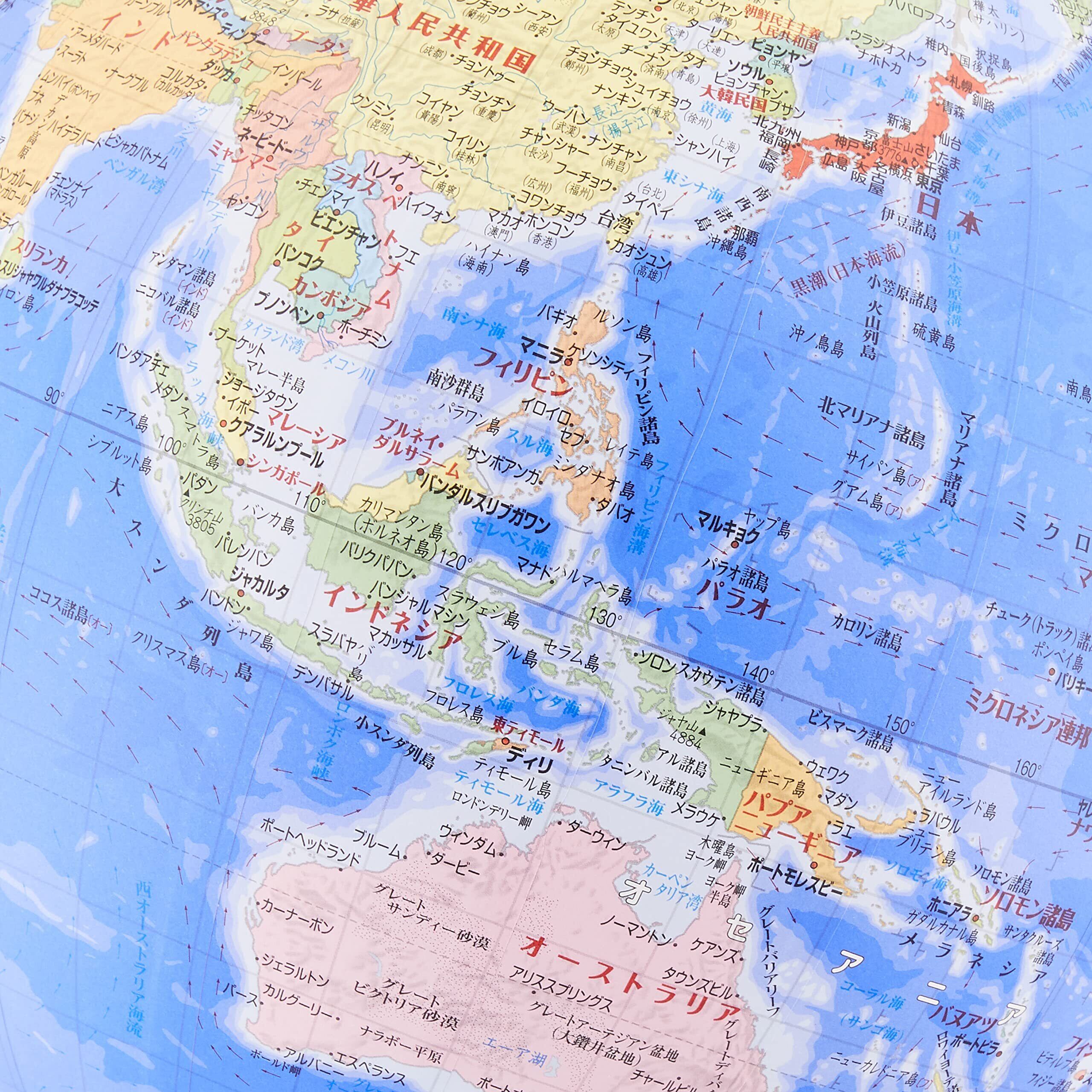 学校でも使用されている行政図(国や地域別の色分け)タイプの地球儀。