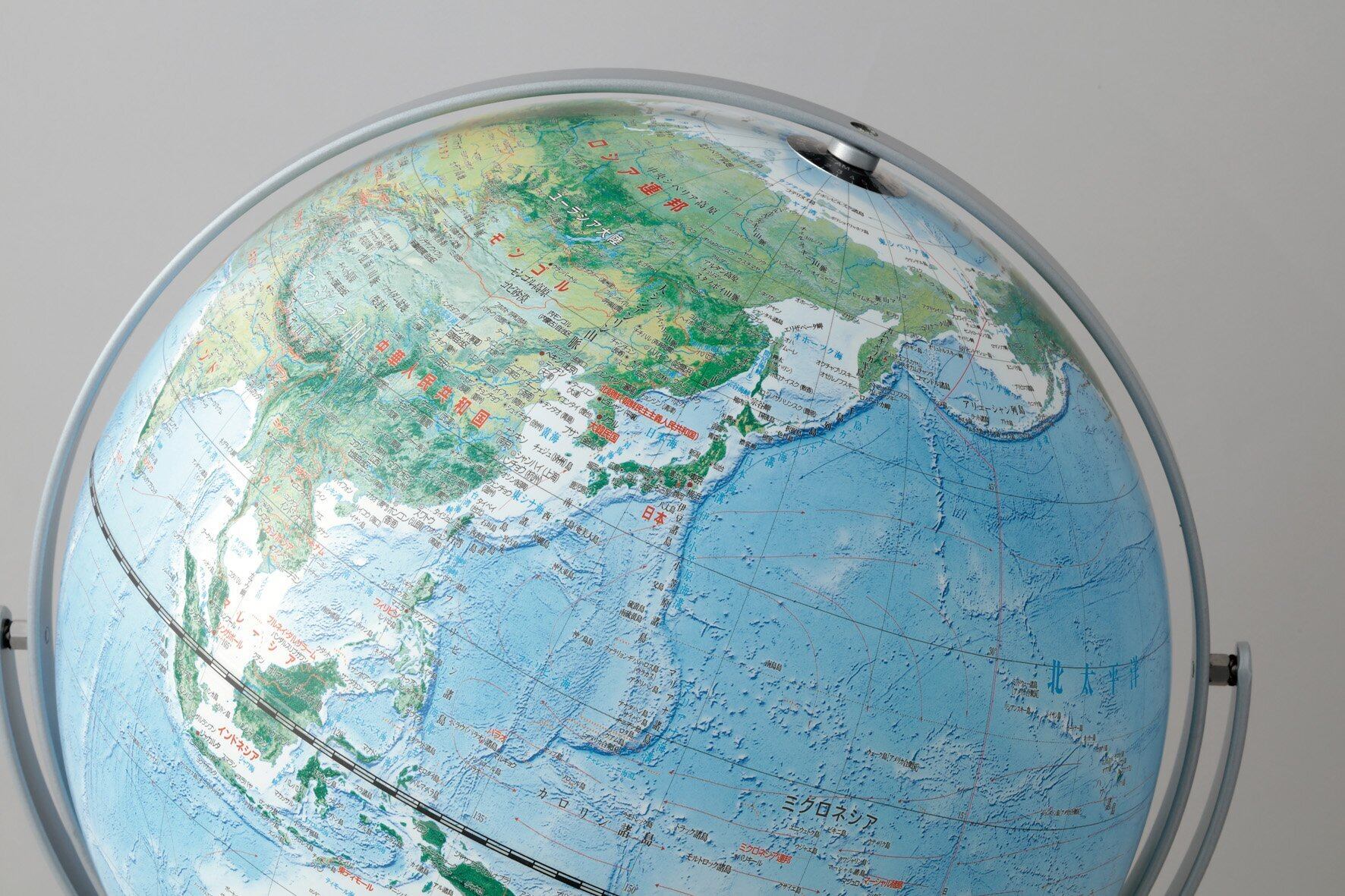「地理情報システム(GIS)」をもとに作成された精密な地図。赤道上にしか継ぎ目が無い「ラミネーションプレス成型」。低反射コーティングで室内のライトが反射しにくく見やすいです。