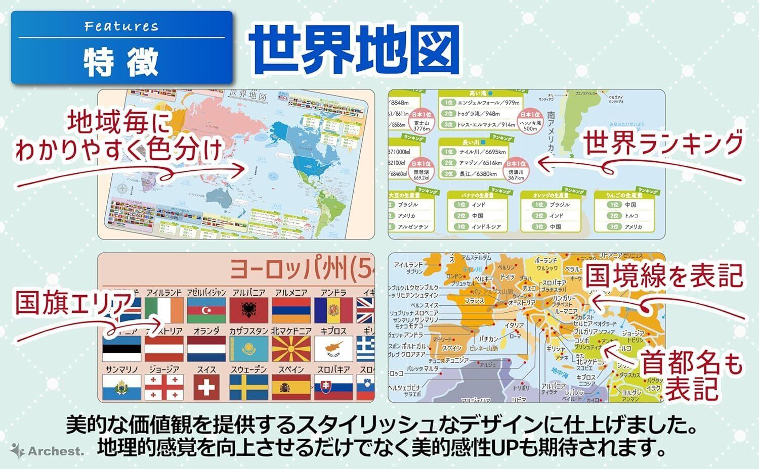 地名、地理情報、国旗などはじめての地理学習におすすめです。また、小さな子でもわかりやすいように、漢字にはふりがなを入れてあります。