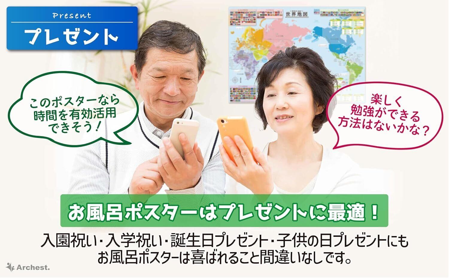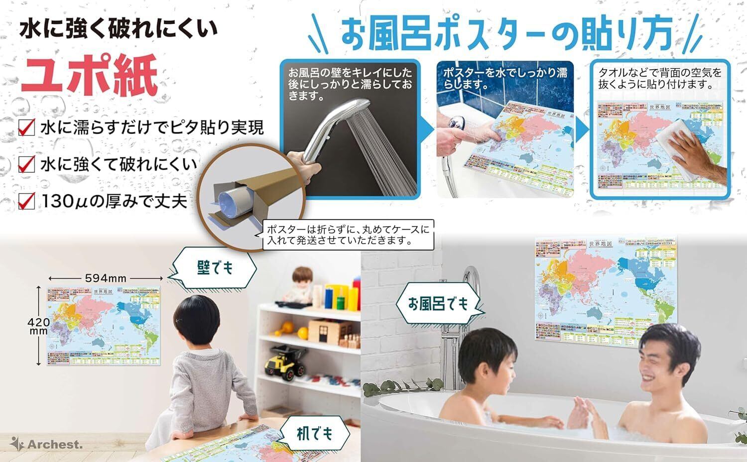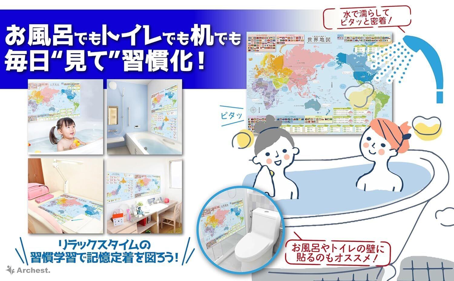 【新着商品】お風呂ポスター 世界地図のみ(1枚入り) A2 【社会・地理の大きな防水学習ポスター】 知育 Archest