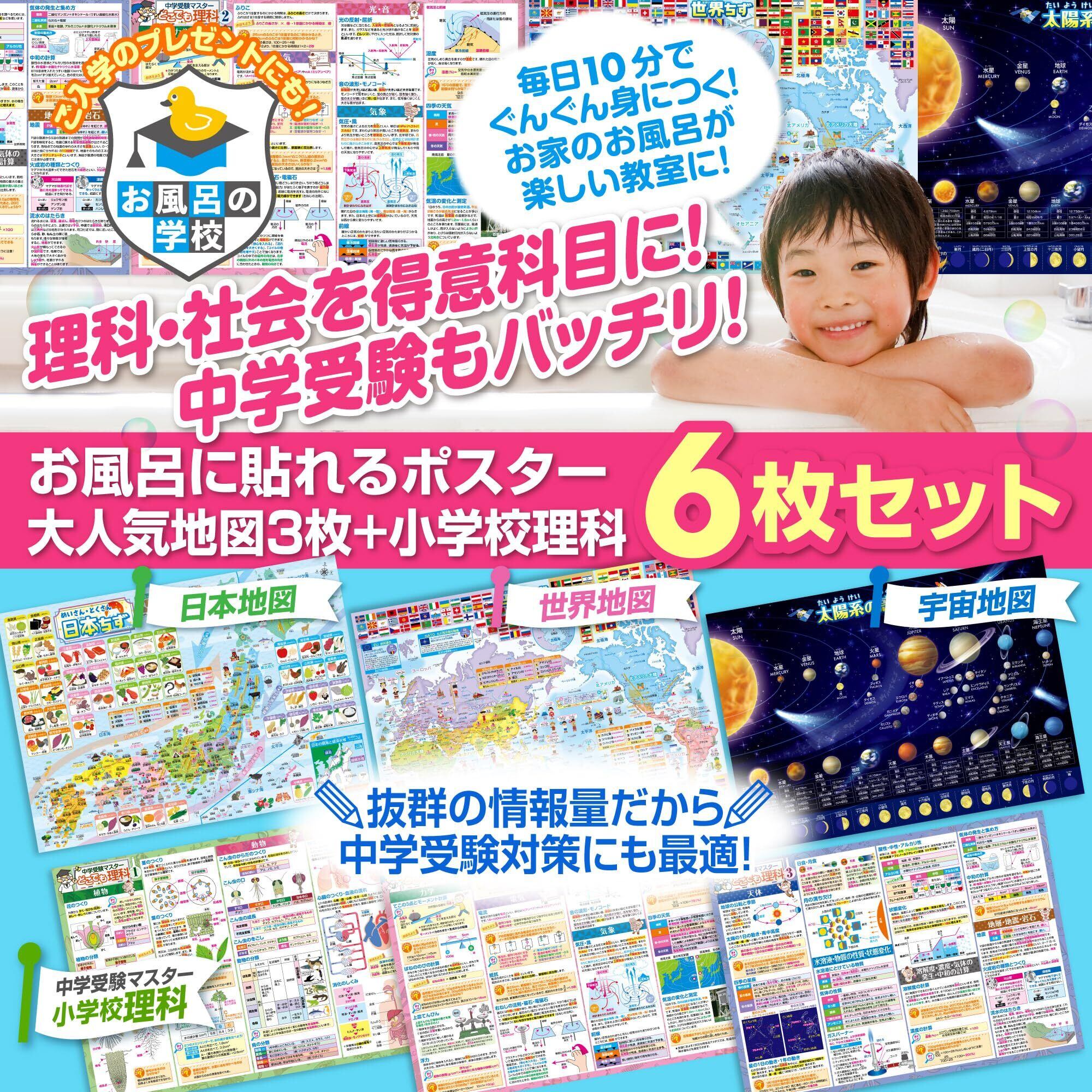 【数量限定】お風呂の学校 セット価格 地図/中学受験理科 お風呂ポスター2種類セット 日本製 地理 学習 知育 社会 理科 中学受験 B3サイズ 防水