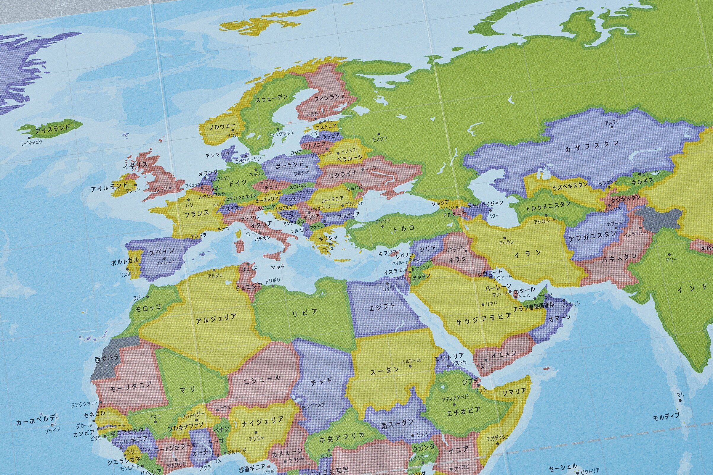 カラフルに色分けされた国々と、白のインクを重ね刷りすることで表現した海の深さが白いグラデーションで描かれています。