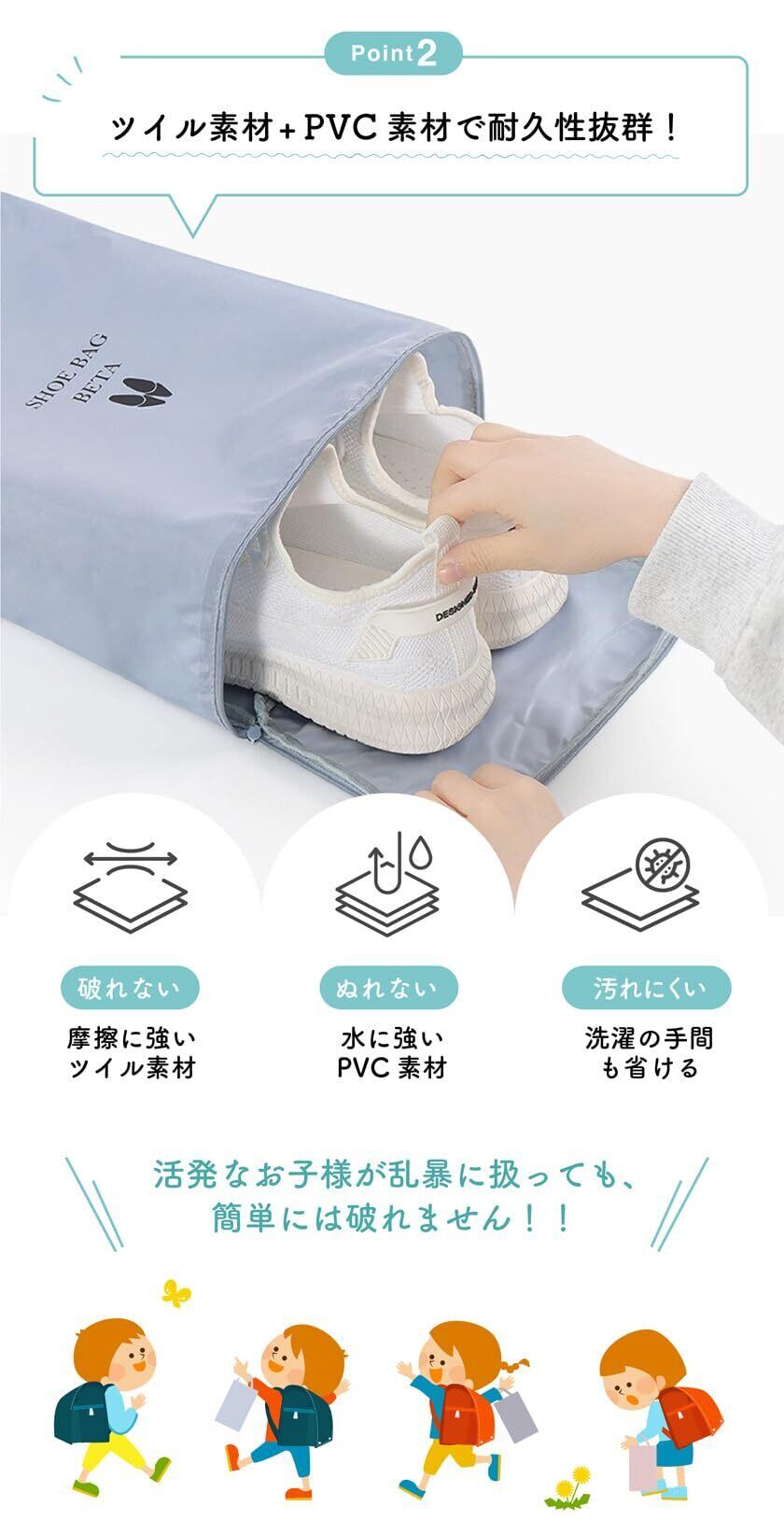 【耐久性】 水に強いPVC素材を使用しており、汚れてしまっても洗えるため、通学用にもぴったりです。