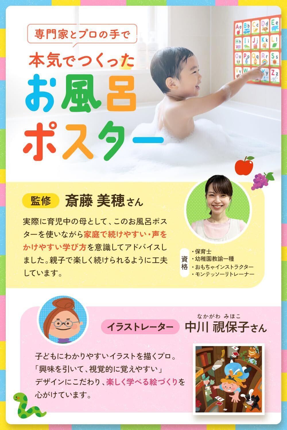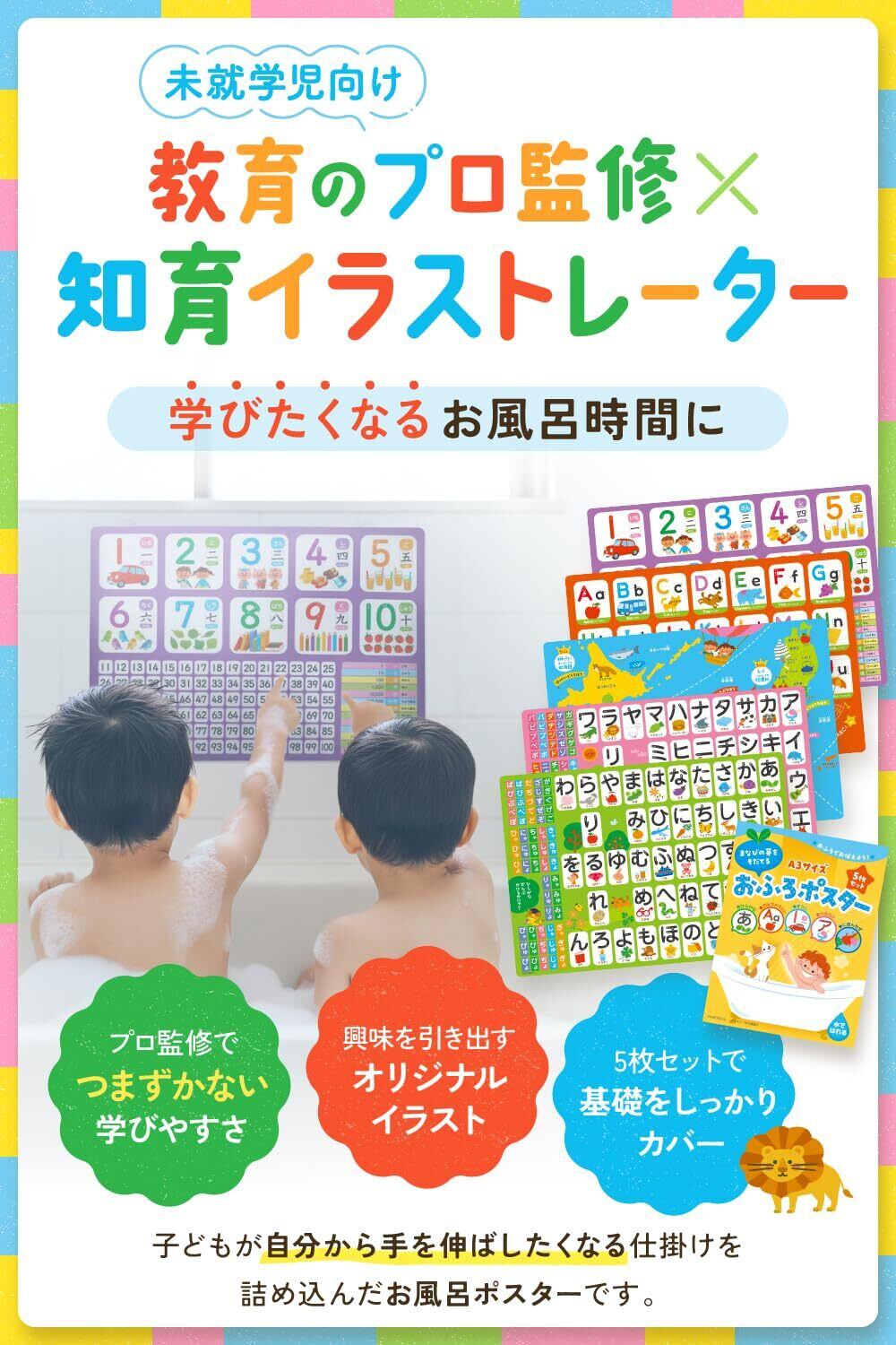【教育のプロ監修で安心の知育設計】教育のプロが内容を監修し、知育イラストレーターが制作。文字量や配置、配色まで細かく設計し、幼児期に無理なく親しめる構成にしています。お風呂時間を「勉強」ではなく、自然に学びにつながる時間へ。入園祝いや誕生日など、プレゼントにも選びやすい知育アイテムです。