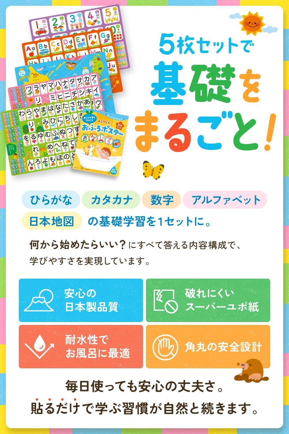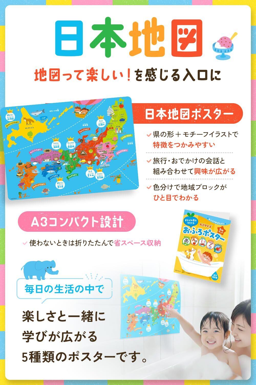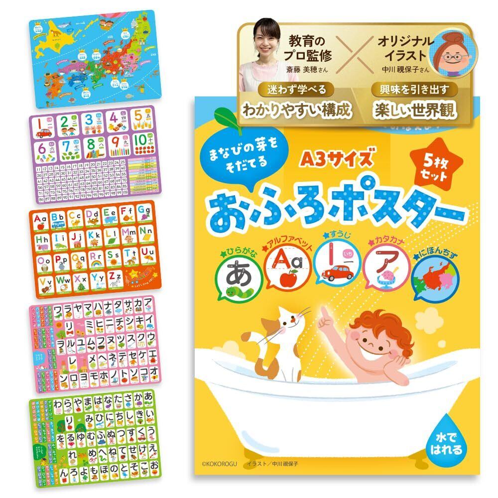 【教育のプロ監修・知育イラストレーター共同制作】お風呂ポスター 日本地図 ひらがな あいうえお表 アルファベット 数字 5枚セット A3 幼児 モンテッソーリ