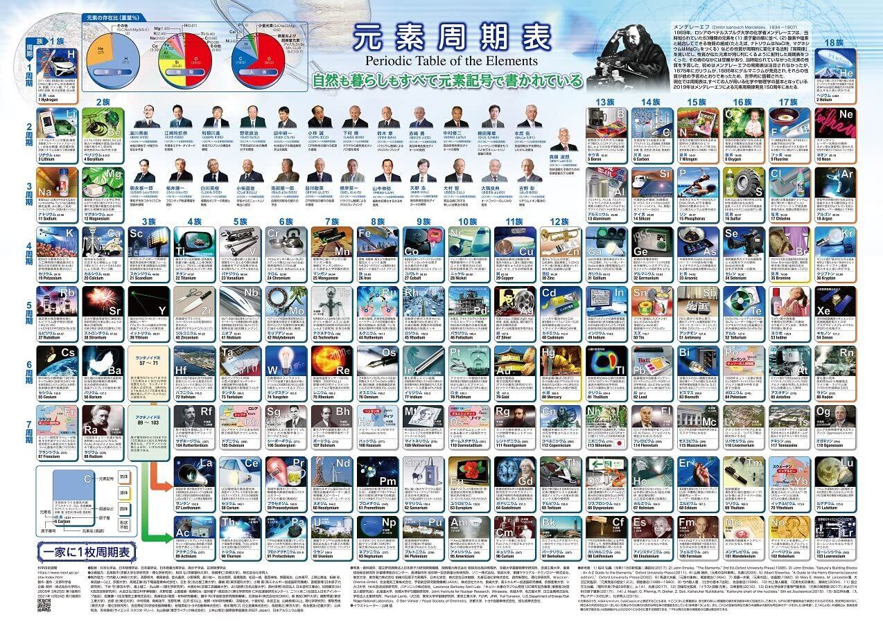 この「元素周期表」は、一つ一つの元素を身近な物質のイラストや写真付きで紹介しています。2006年に第1版が発表されました。以後も改訂・更新を重ねて、現在では多くの方から親しまれています。自然も暮らしもすべて元素記号で書かれている!周期表は化学や物理の基本です。ノーベル賞を受賞した日本人科学者の肖像入り。
