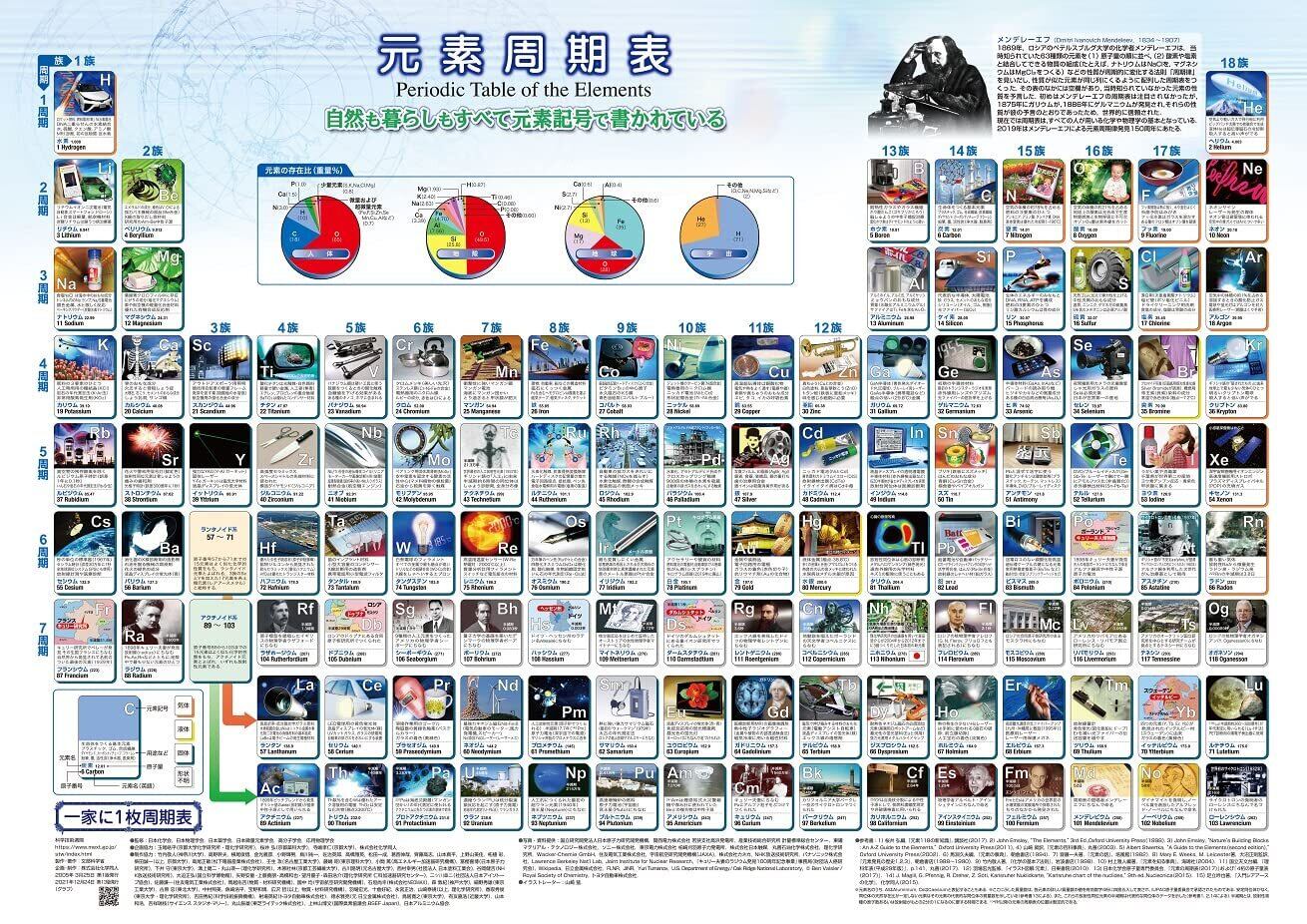 この「元素周期表」は、一つ一つの元素を身近な物質のイラストや写真付きで紹介しています。2006年に初版(第1版)が発表されました。以後も改訂・更新を重ねて、現在では多くの方から親しまれています。自然も暮らしもすべて元素記号で書かれています。周期表は化学や物理の基本です。