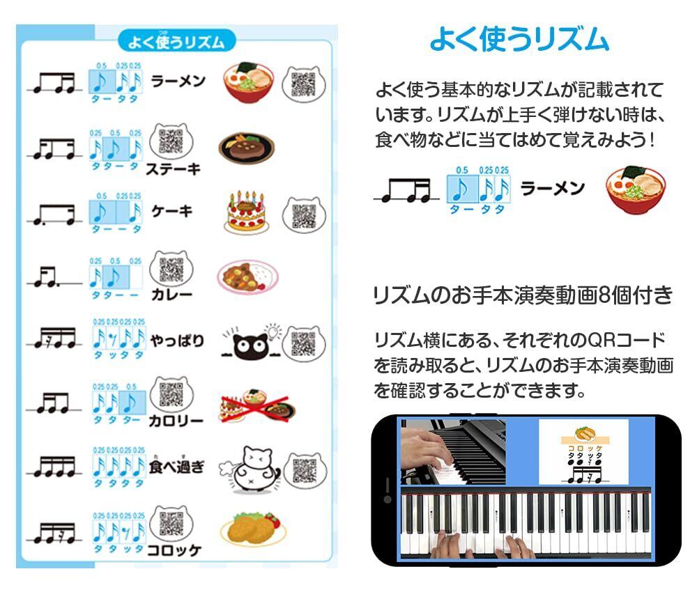 リズム横にある、それぞれのQRコードを読み取ると、リズムのお手本演奏動画を確認することができます。