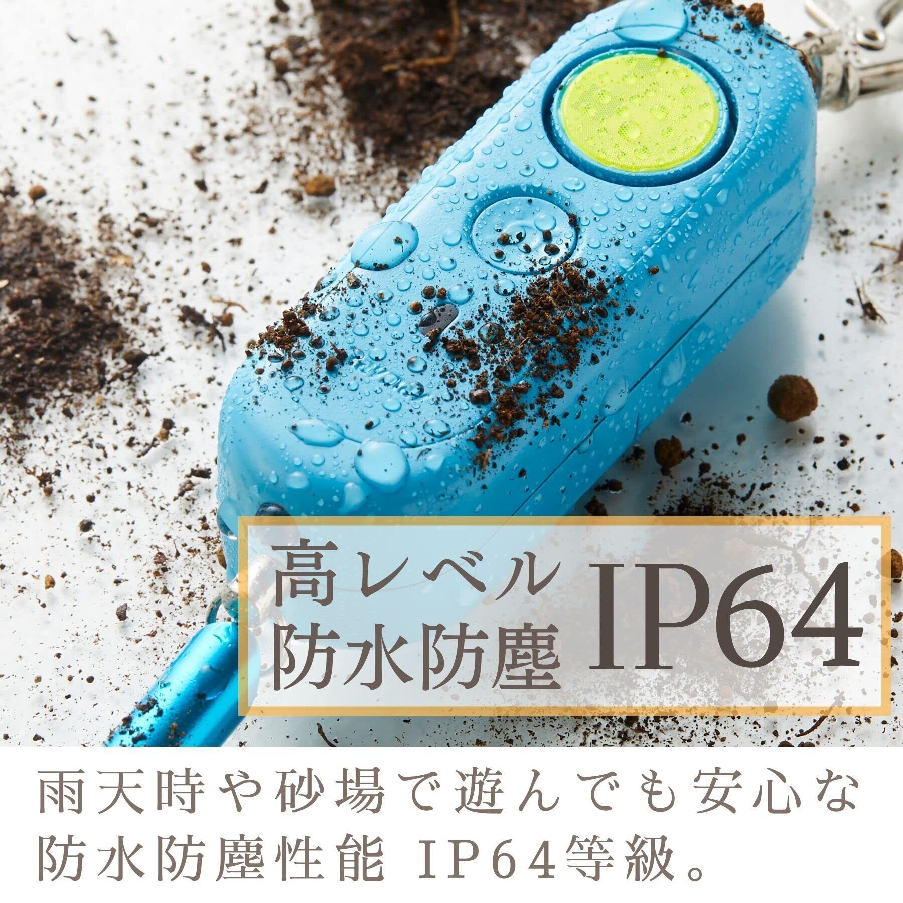 大音量で鳴るホイッスルがついた防犯ブザー。高レベルの防水防塵機能(IP64)。