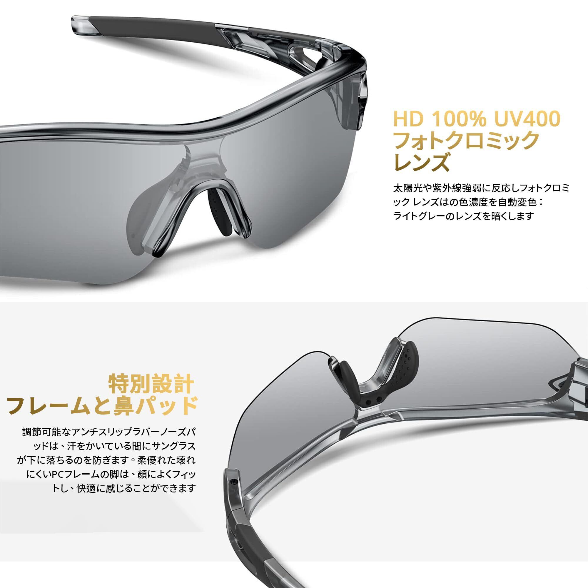 柔らかいフレーム素材: 軽量なTR90リムレスジャケットフレームの設計は剃りにくく、耐衝撃性、耐傷性、耐久性に優れた壊れにくいです。汗をかいたときにサングラスが落ちるのを防ぎ、顔にしっかりとフィットする柔軟滑り止めゴム鼻パッド。サングラス 夜間運転用は高品質で超軽量、強度、柔軟性、安定性が高く、高速スポーツ時にクリアな視界を提供しており、日本人のために設計されています