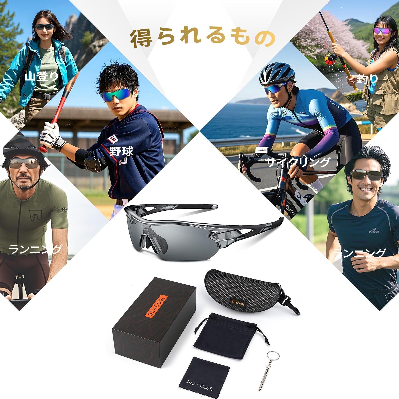[BEACOOL] スポーツサングラス 偏光レンズ ランニング 野球 登山 釣り 自転車 ドライブ バイク ゴルフ テニス スポーツ 超軽量 TR90 TAC UV400 紫外線防止 メンズ レディース ユニセックス 兼用サングラス