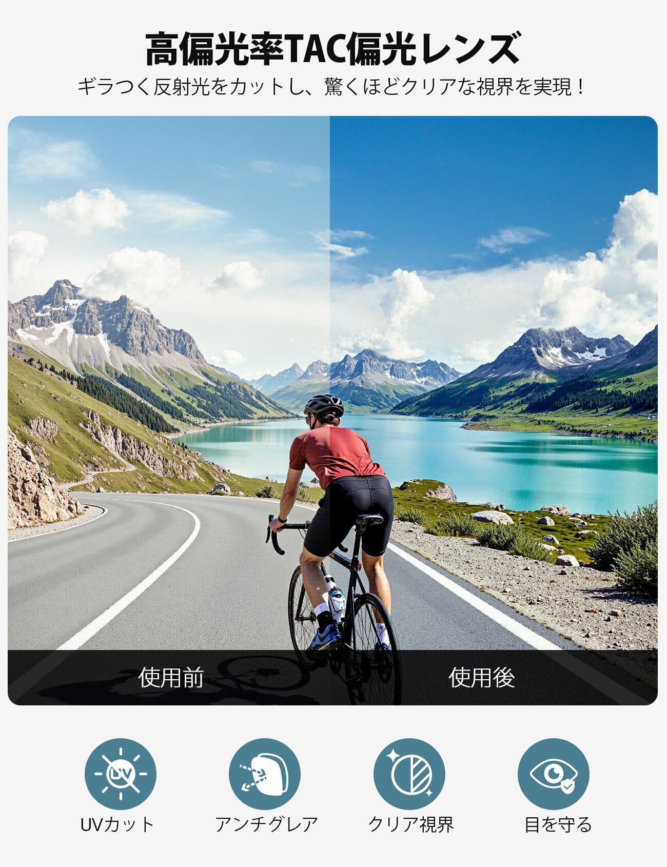 【TAC偏光レンズで晴も雨も快適視界】アウトドアスポーツでの眩しさや紫外線から目を守る「TAC偏光レンズ」を採用!高偏光率でギラつく反射光をカットし、海・湖面のギラツキや雪山の照り返しから目を守ります。自転車やゴルフなど、スポーツシーンでの視界をクリアに保ちます。驚くほどクリアな視界で、スポーツのパフォーマンス向上を実感。UV99%遮断で長時間のロードバイク、釣りや登山でも安心して使用可能