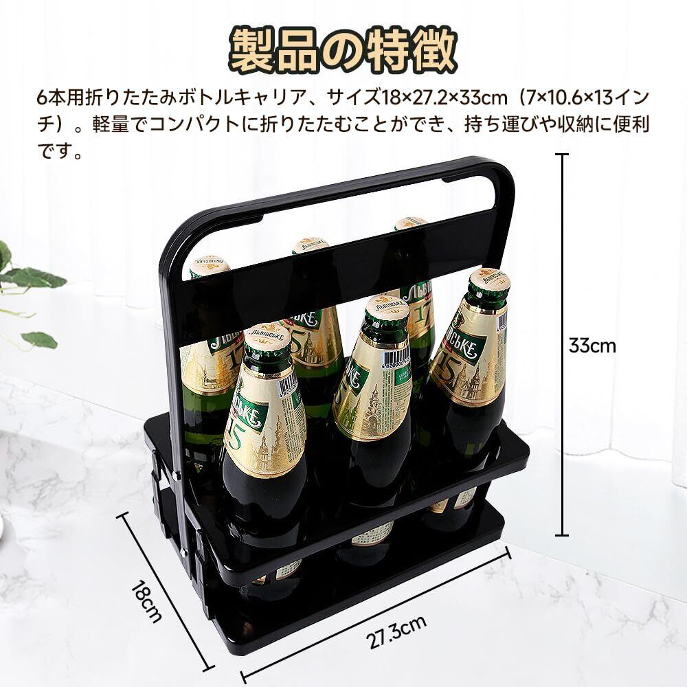 【製品の特徴】6本用折りたたみボトルキャリア、サイズ18×27.2×33cm(7×10.6×13インチ)。軽量でコンパクトに折りたたむことができ、持ち運びや収納に便利です。