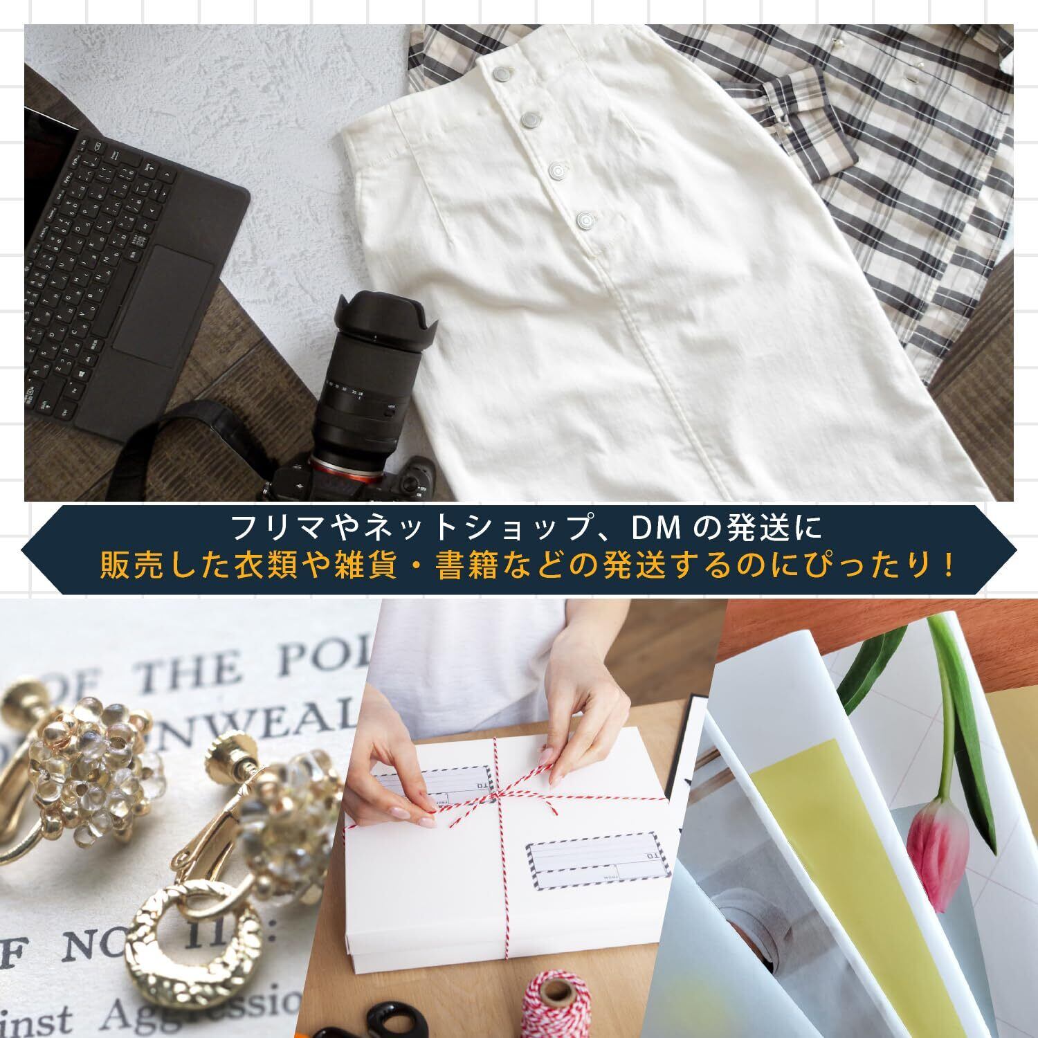 衣類や小物、グッズや書籍、CDなども安心して発送できます。嫌な臭いがしないので衣類を入れても臭いがつきません。糊で簡単に貼り付け梱包することができます。