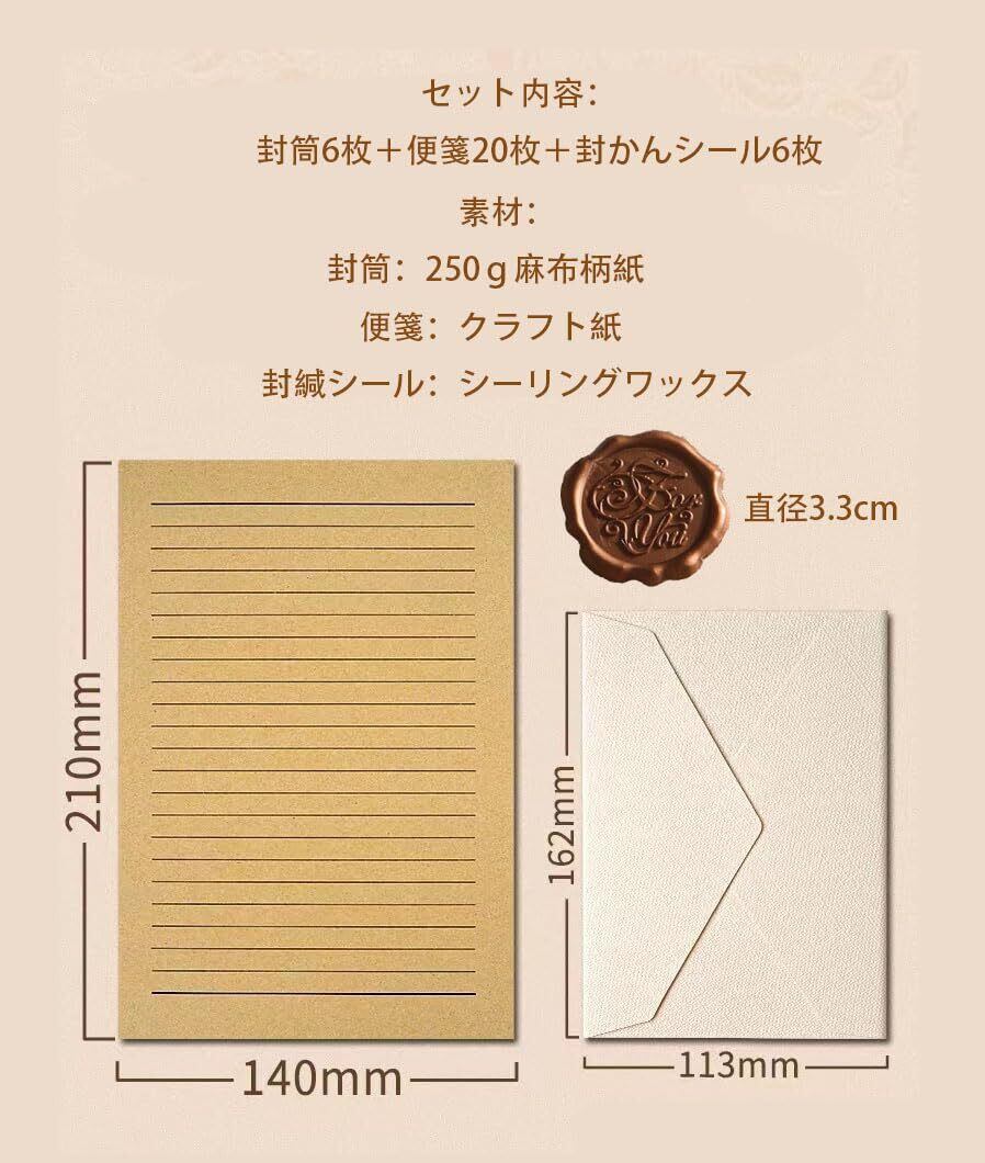 【数量限定】レターセット 手紙セット 封筒6枚 便箋20枚 封緘シール6枚 ラブレター メッセージカード 麻布柄 お見舞い 誕生日 招待状 結婚式 お祝い手紙 お礼状用 (ベージュ)