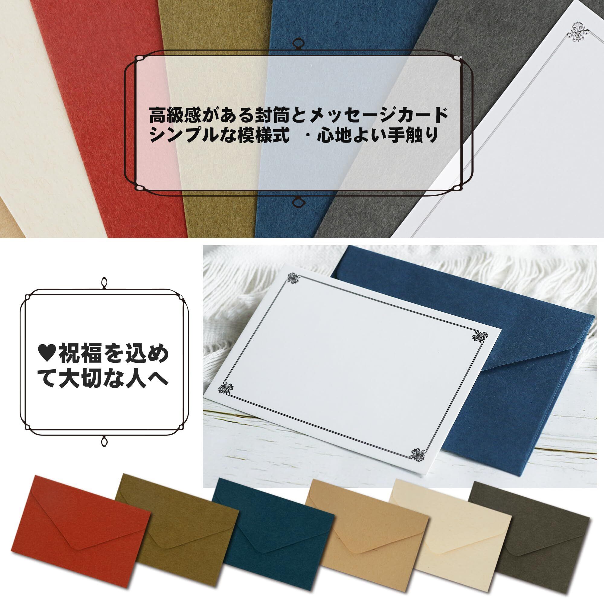 【質感・デザイン】封筒やミニメッセージカードは厚みがある紙質を使い、インクの吸い込み具合はばっちり、手触り心地と書き心地も良いです。デザインはアンティーク調な色とパターンを採用して、シンプルで高級感を演出します。