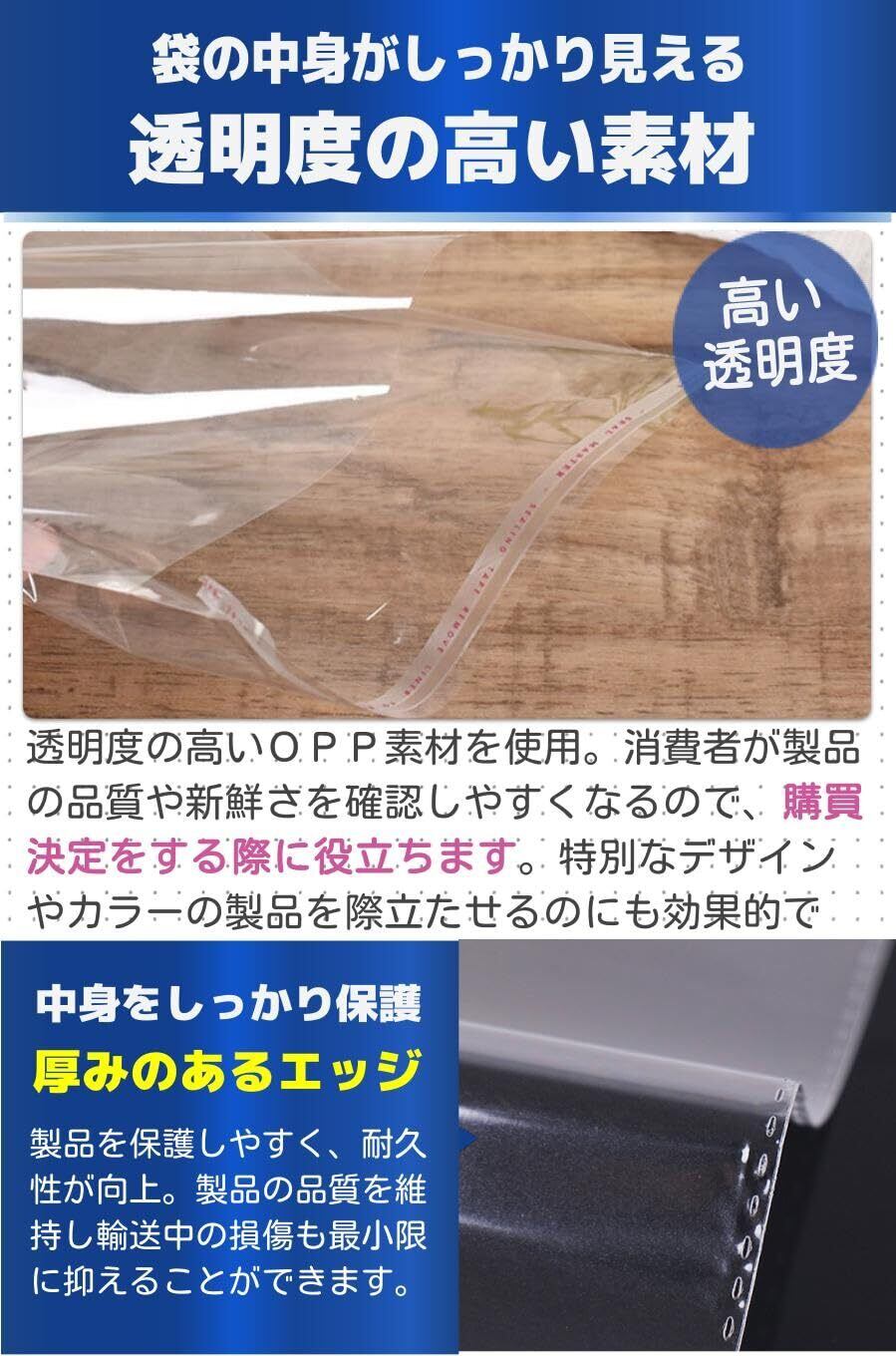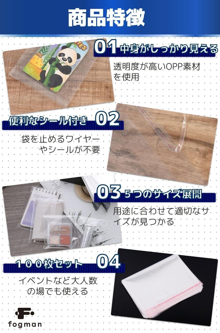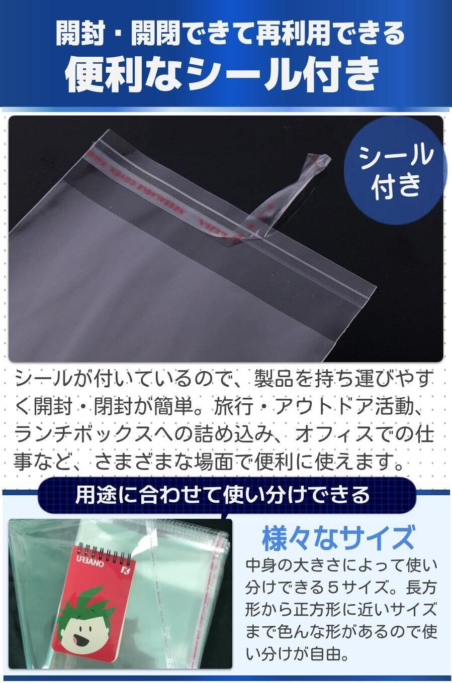 【商品特徴】①中身がしっかり見える:透明度が高いOPP素材を使用/②便利なシール付き:袋を止めるワイヤーやシールが不要/③5つのサイズ展開:用途に合わせて適切なサイズが見つかる/④100枚セット:イベントなど大人数の場でも使える