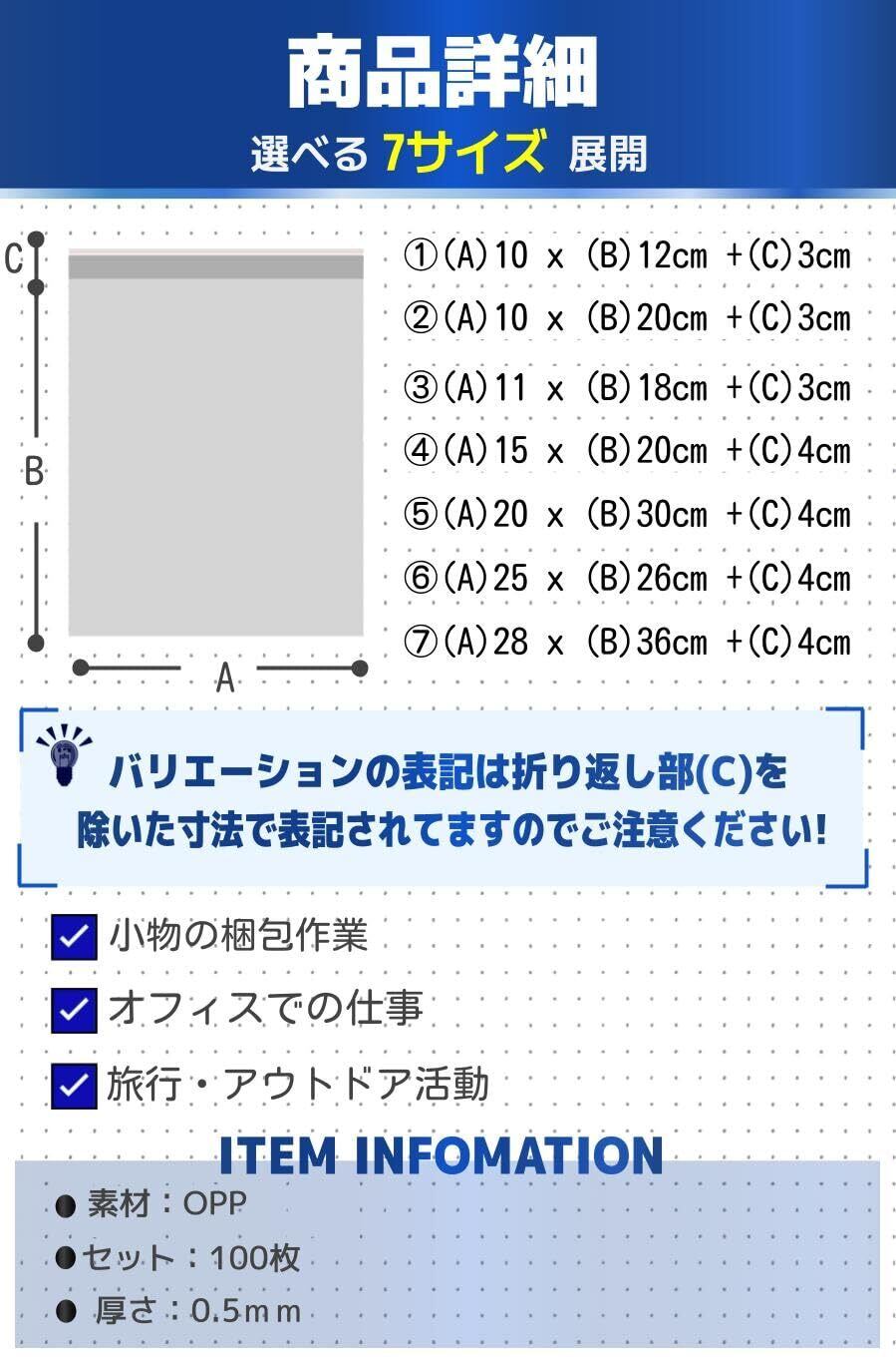 【商品詳細】素材:OPP厚さ:0.5mm/セット:100枚/サイズ:①(A)10 x (B)12cm +(C)3cm/②(A)10 x (B)20cm +(C)3cm/③(A)11 x (B)18cm +(C)3cm/④(A)15 x (B)20cm +(C)3cm/⑤(A)20 x (B)30cm +(C)4cm/⑥(A)25 x (B)26cm +(C)4cm/⑦(A)28 x (B)36cm +(C)4cm