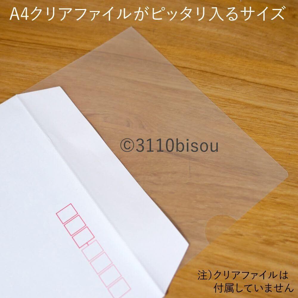 A4用紙そのままでも、一般的なA4サイズクリアファイルに閉じても、折らずに入れられる封筒です。