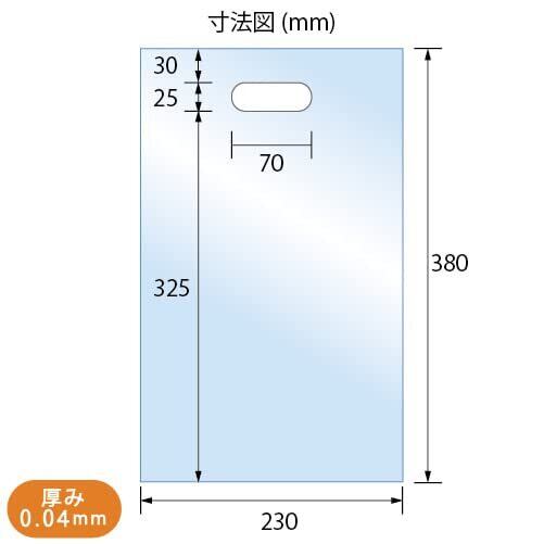 サイズ[mm]:幅230x長さ380x厚さ0.04・OPP製の手提げ袋(小判抜きタイプ)です。軽く、高透明で中身がよく見える手提げ袋で、展示会、営業回り、イベント等でのチラシ、パンフレット、ごく薄手の冊子、粗品、ごく軽くて小さいノベルティ等を配布する等の用途で、手軽に大量の枚数を利用でき、経済的な手提げ袋です。A4サイズの文書を入れることが可能です。重量物を入れるのには不向きです。法人・店舗様のまとめ買いにもおすすめです。