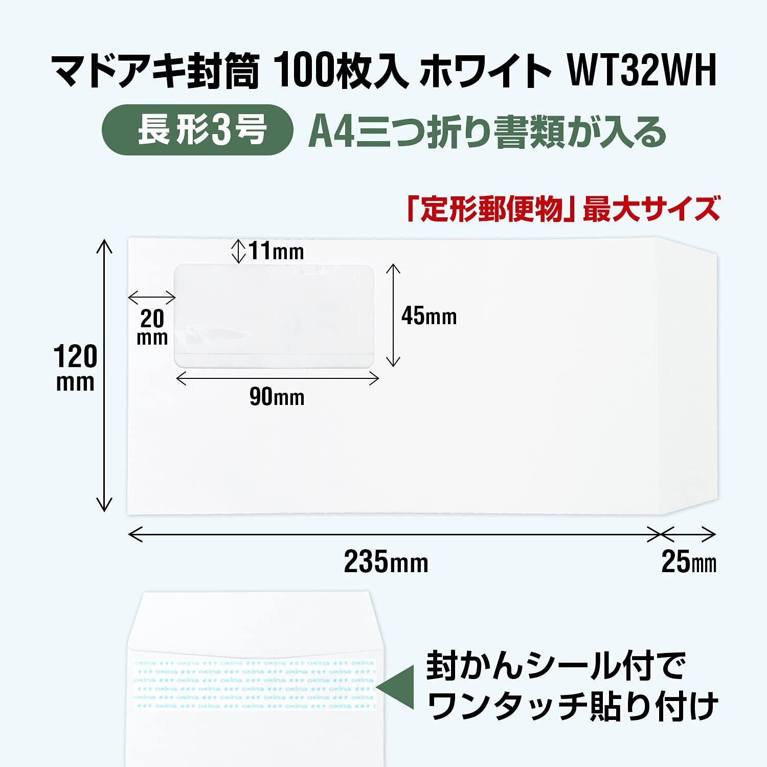 オキナ マドアキ封筒 ワンタッチ 長形3号 ホワイト 100枚入 80g WT32WH