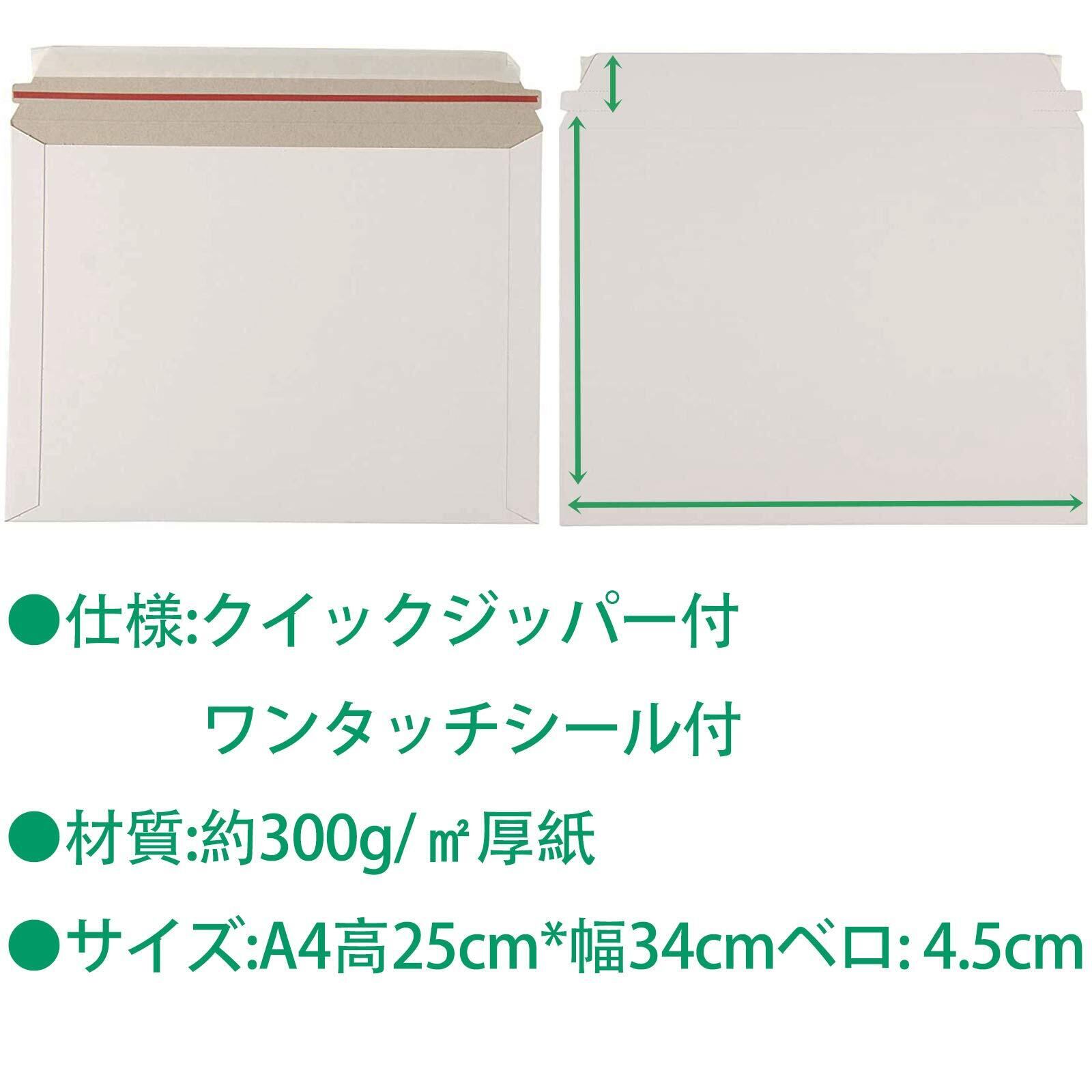 高品質、便利: ホワイトの表面素材でクリーンな印象、裏はボール紙で厚みは300g/㎡としっかりとした厚みで強度がございます。 封函時に便利なシール、開封時に便利なジッパーの両方がついた、機能面でも便利な封筒です。折り曲げずに内容物が送れ、ベロ部分に入ったシングルジッパーは簡単に開封することができゴミを出しません。