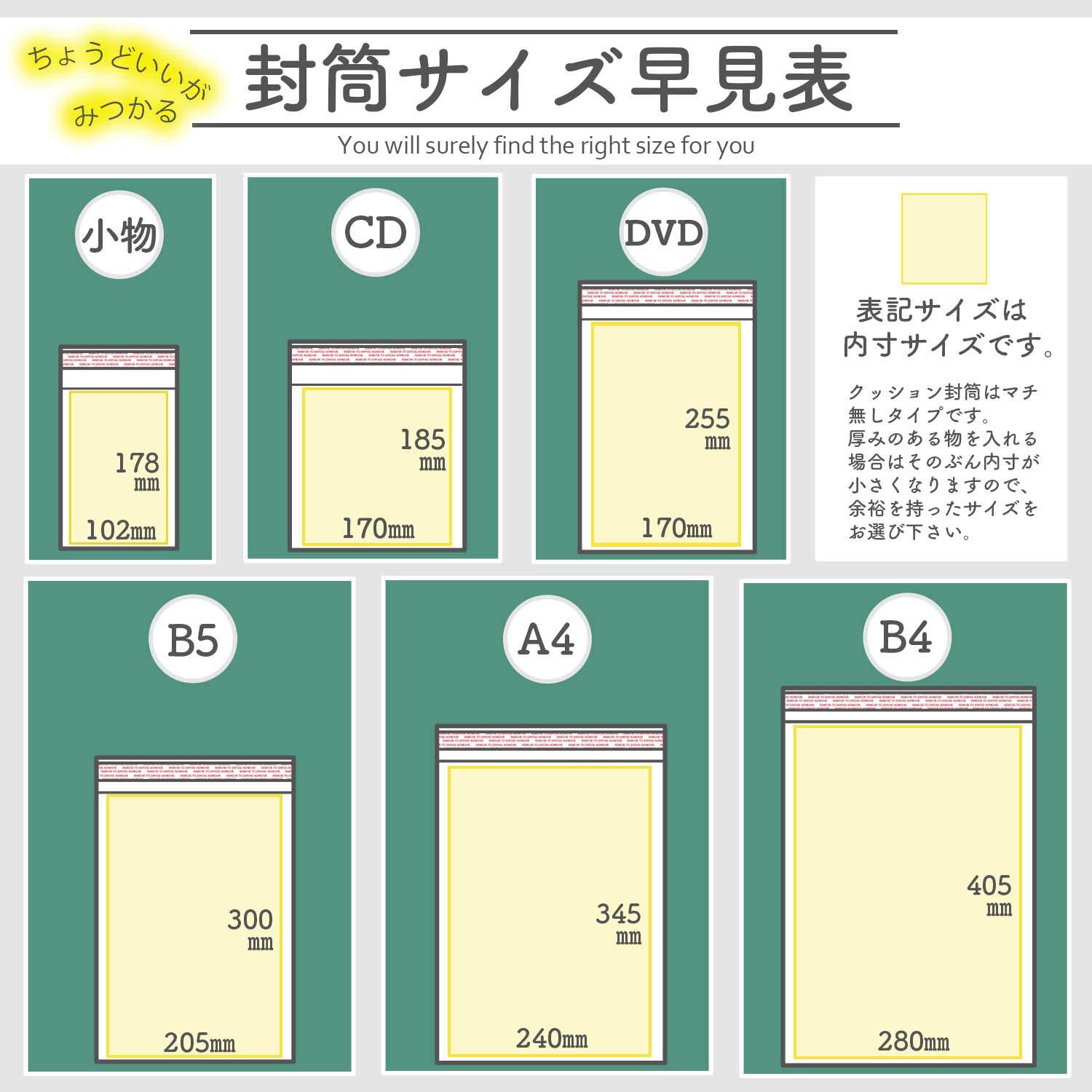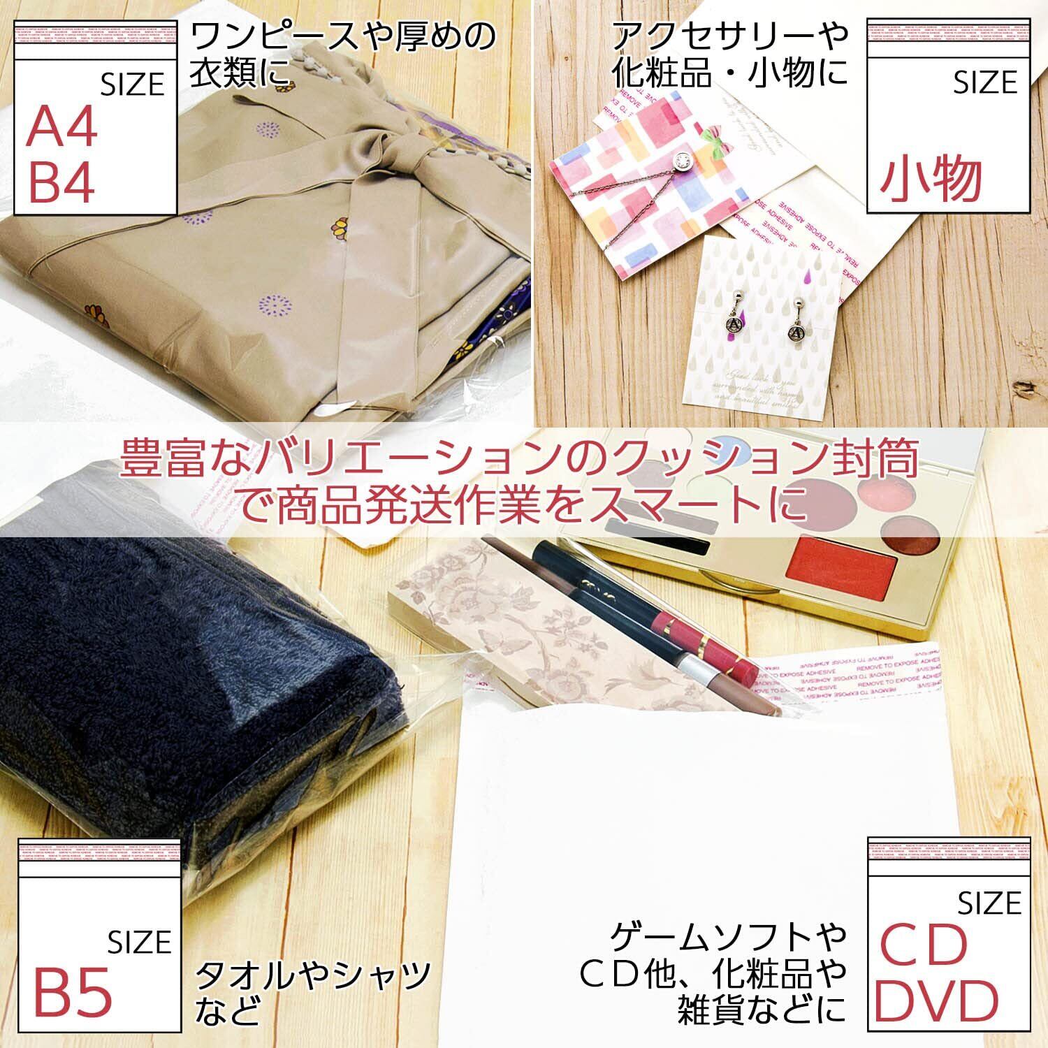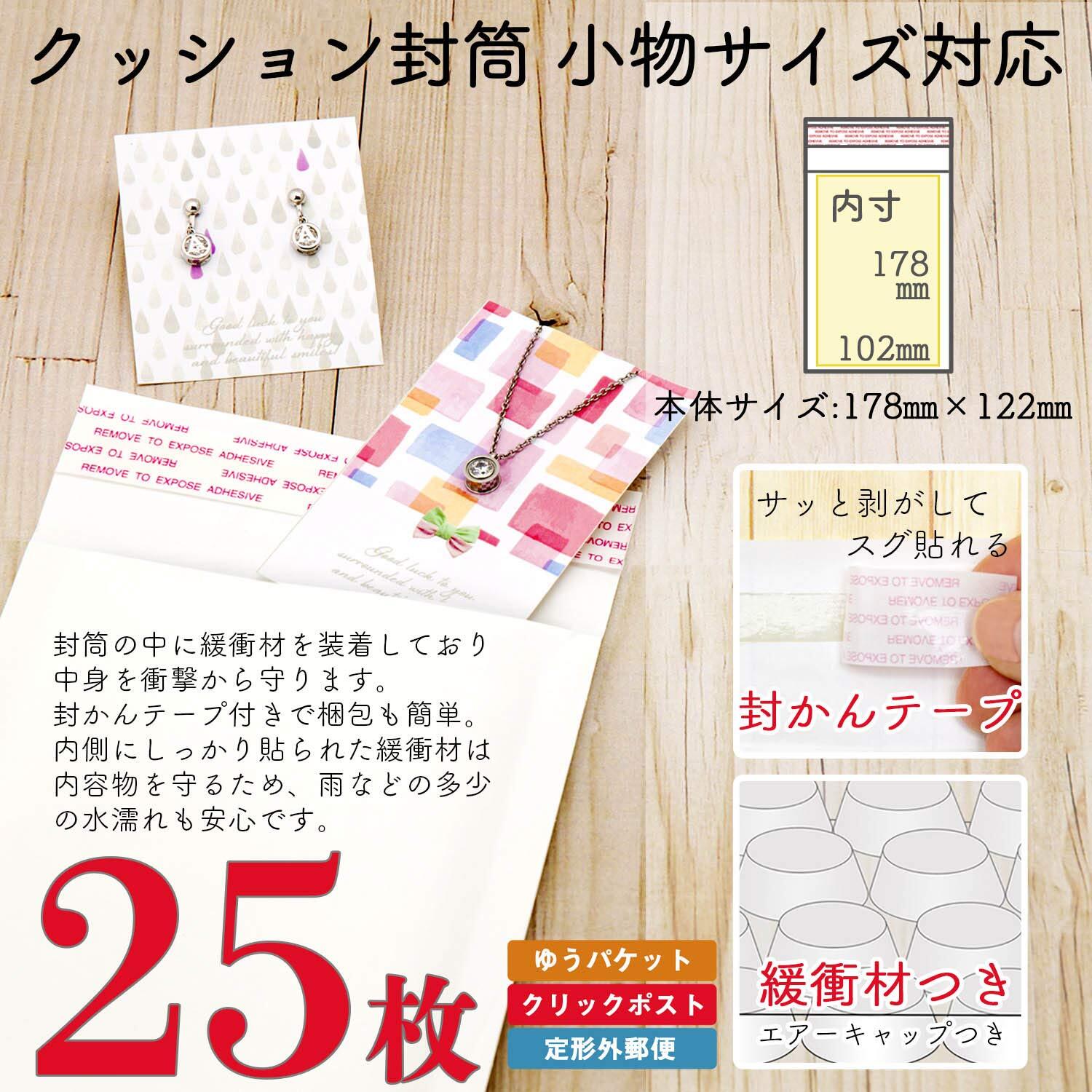 封筒の中に緩衝材(プチプチ)を装着しており、中身を衝撃から守ることができる。衝撃を与えたくない物を発送するのに向いている。テープ付きのため、簡単に梱包できる。防水にも優れいている。