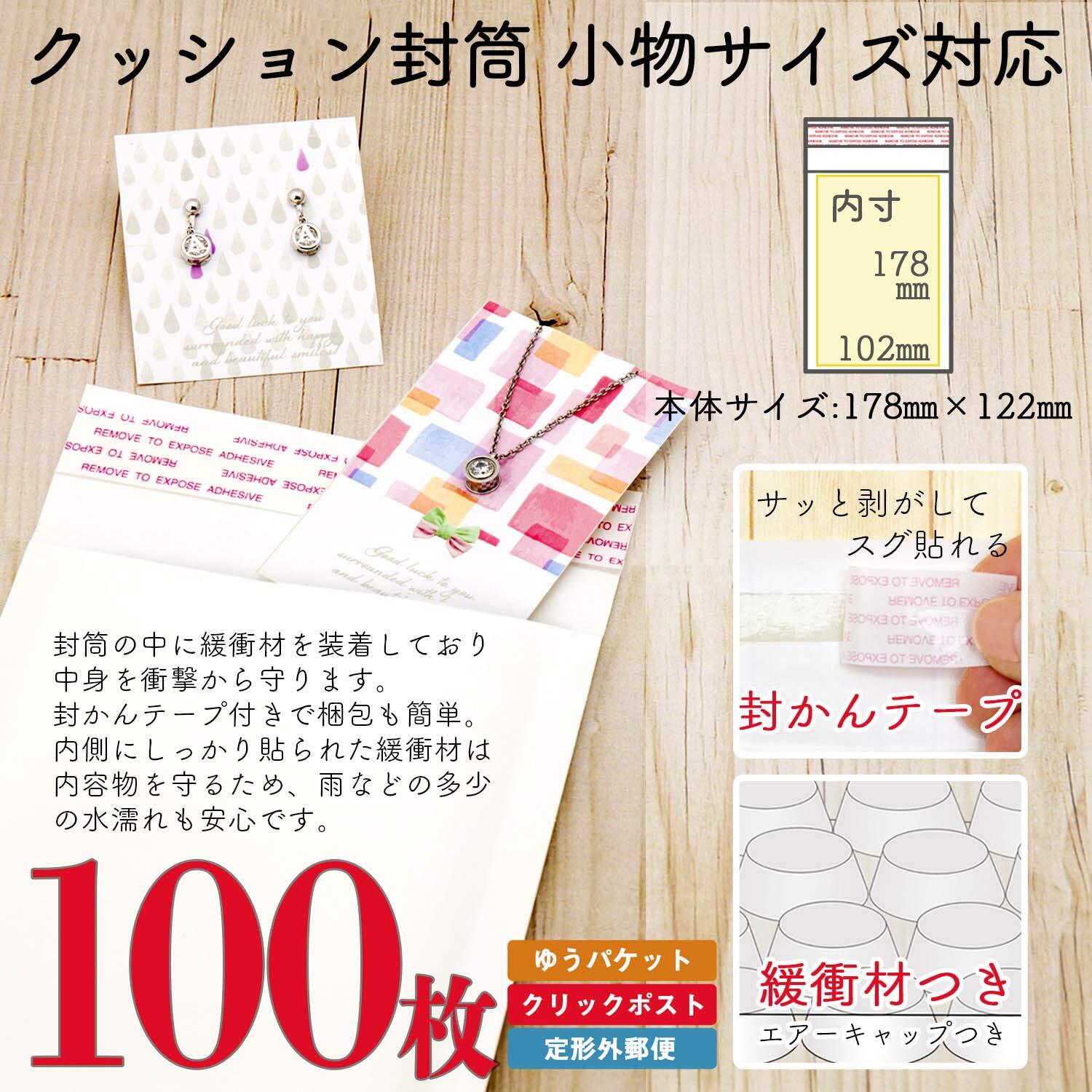 封筒の中に緩衝材(プチプチ)を装着しており、中身を衝撃から守ることができる。衝撃を与えたくない物を発送するのに向いている。テープ付きのため、簡単に梱包できる。防水にも優れいている。
