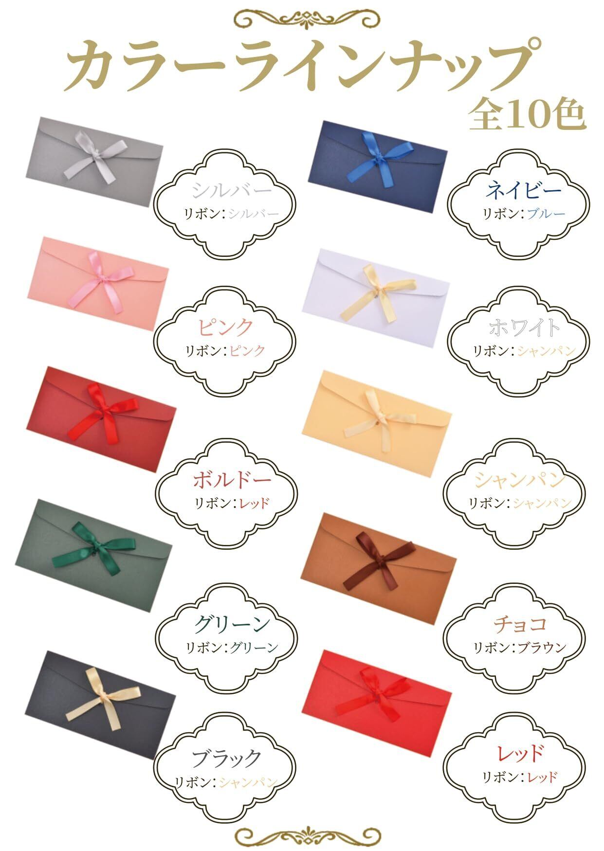 上質な厚紙製の封筒に、色合いを合わせたサテンリボンが標準で付属