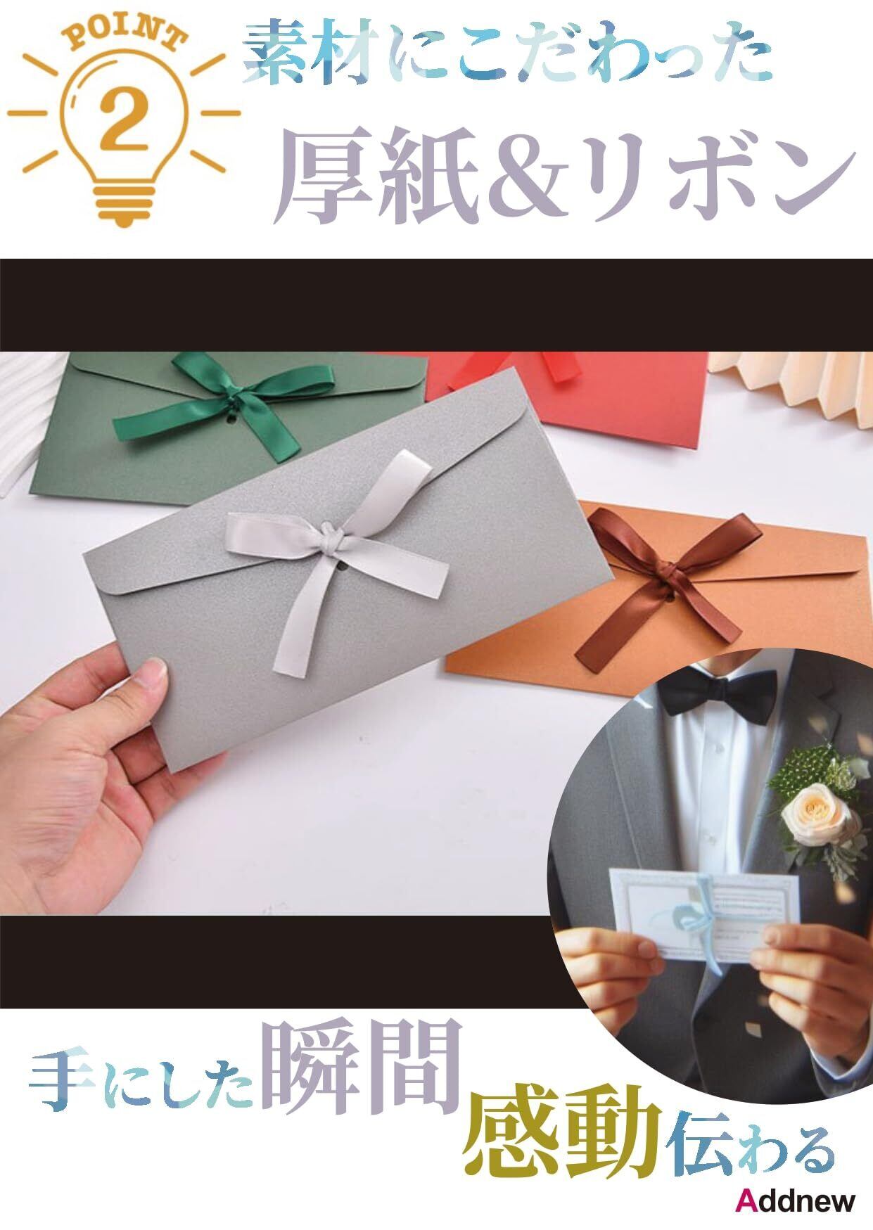 彩り豊かな封筒にサテンリボンが添えられた「Addnewリボン付き封筒」は、特別な瞬間をさらに華やかに演出
