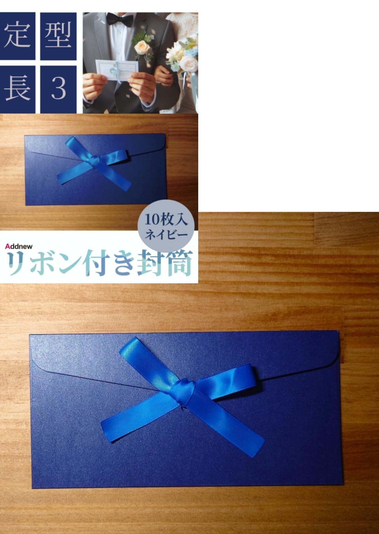 【新春セール】リボン付き封筒 10枚入 定型 長3 厚紙封筒 サテンリボン 商品券 招待状 おしゃれ (ネイビー)