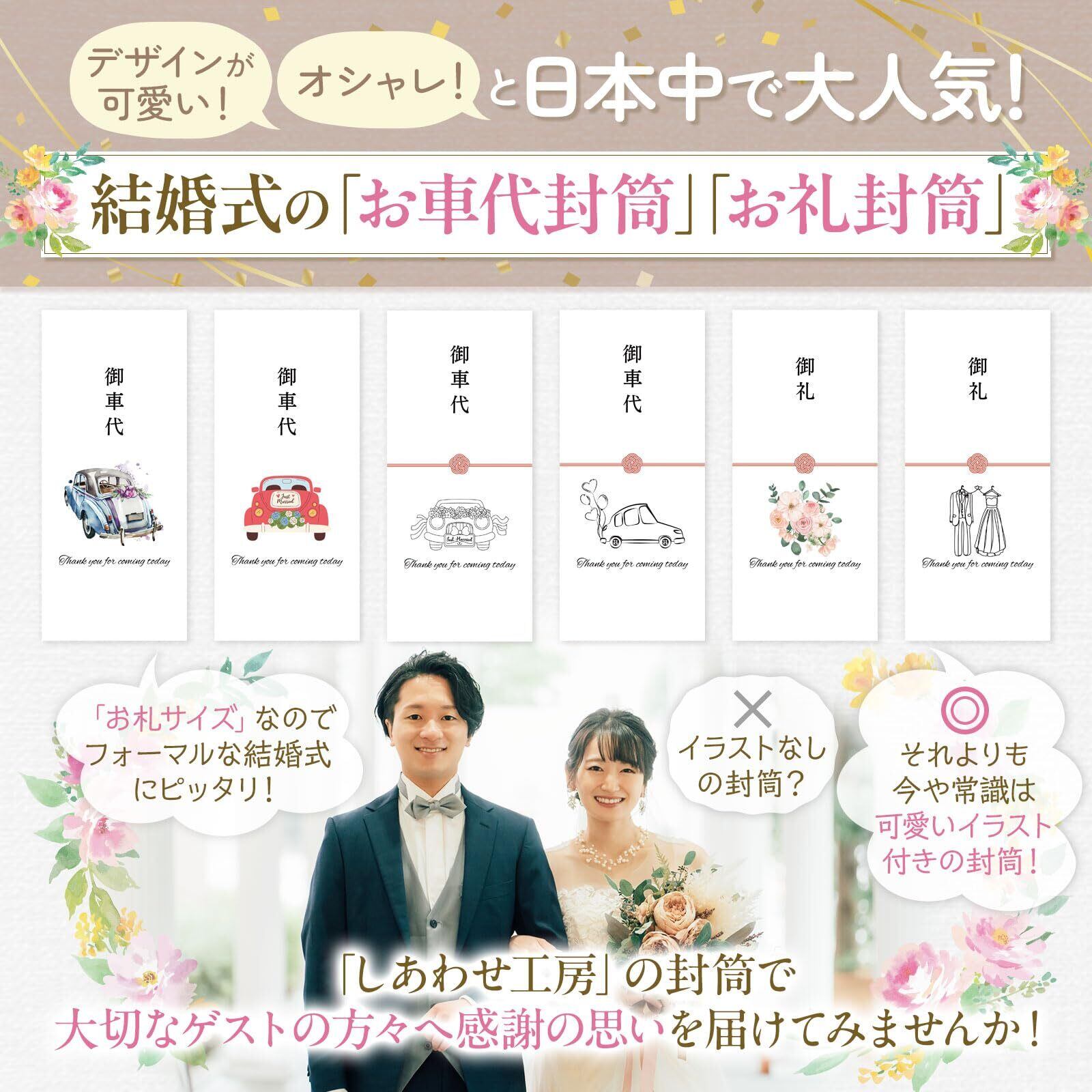 [しあわせ工房] お車代 お礼 封筒 12枚入 結婚式 ウェディング 結婚 可愛い かわいい お洒落 おしゃれ 御車代 お車料 お車代封筒 お礼封筒 御礼 ポチ袋 名入れ 無し (4.線画車 風船 水引あり AA010)